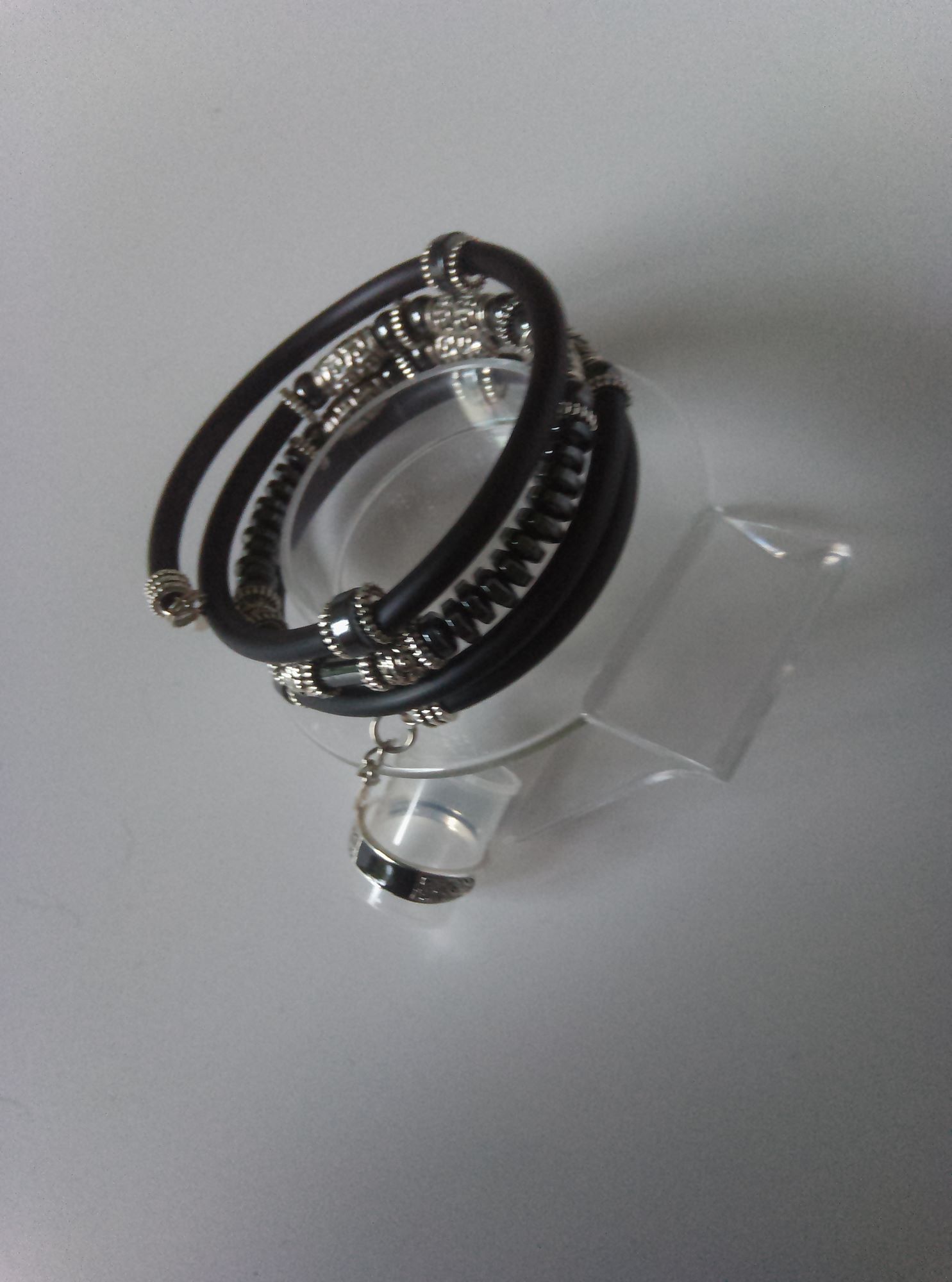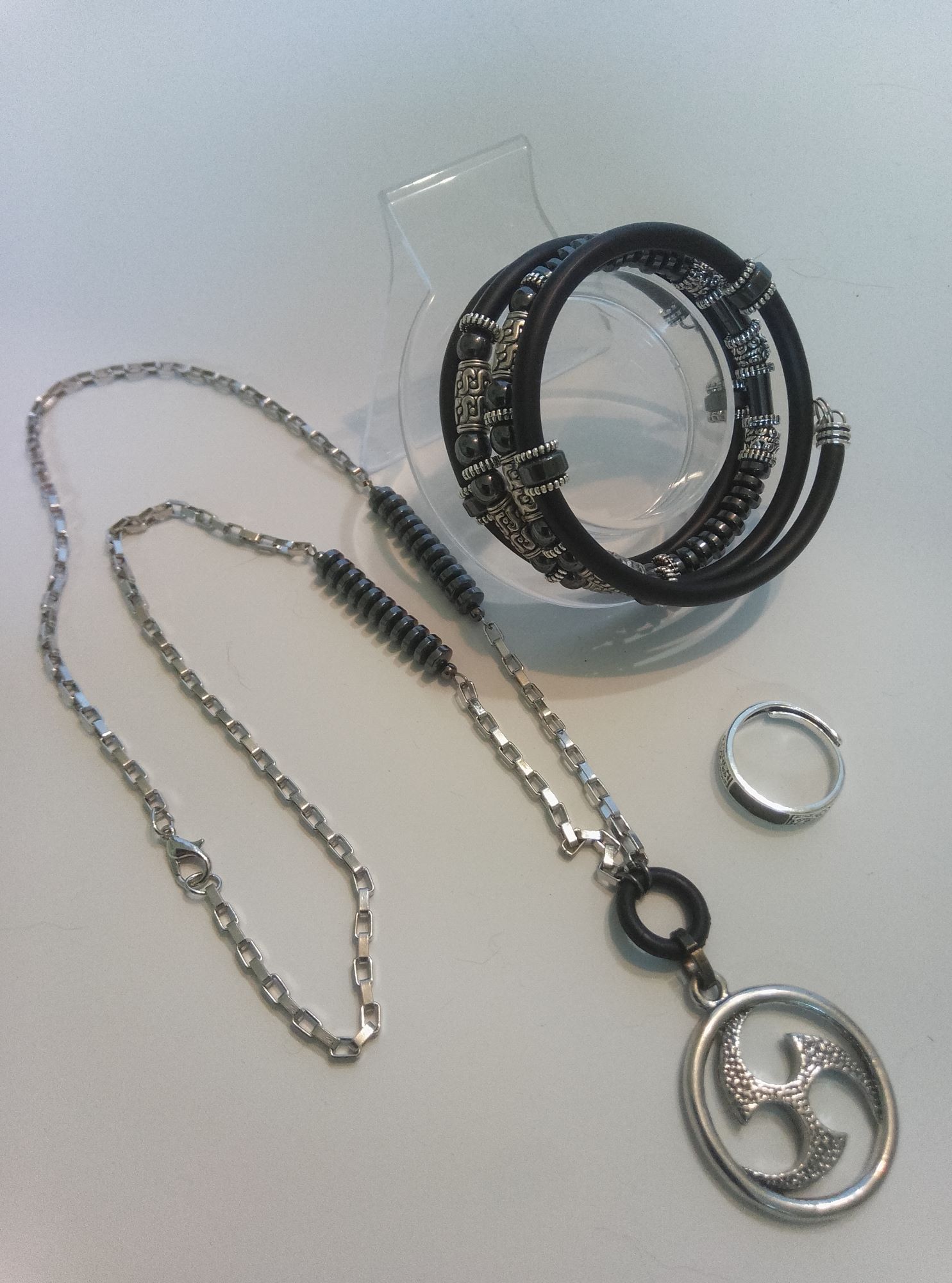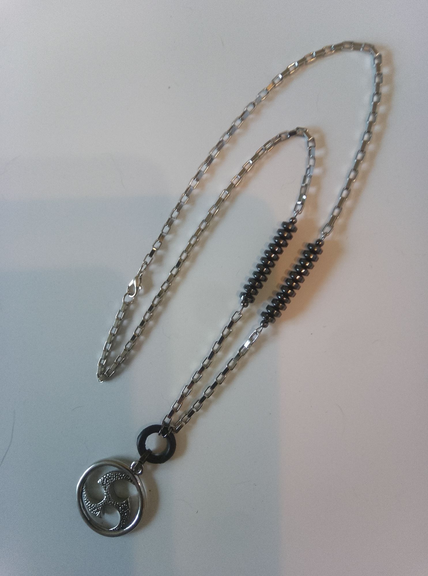 Комплект включає ланцюжок 60 см з підвіскою “Коловрат” діаметром 30 мм, браслет спіральний на меморі-дроті, каблучку регульованого розміру з чорною емаллю. Матеріал – гематит намистини круглі діаметром 6 мм, диски діаметром 8 та 6 мм, шнур ПВХ порожнистий, сплав ювелірний. Фурнітура сріблястого кольору.