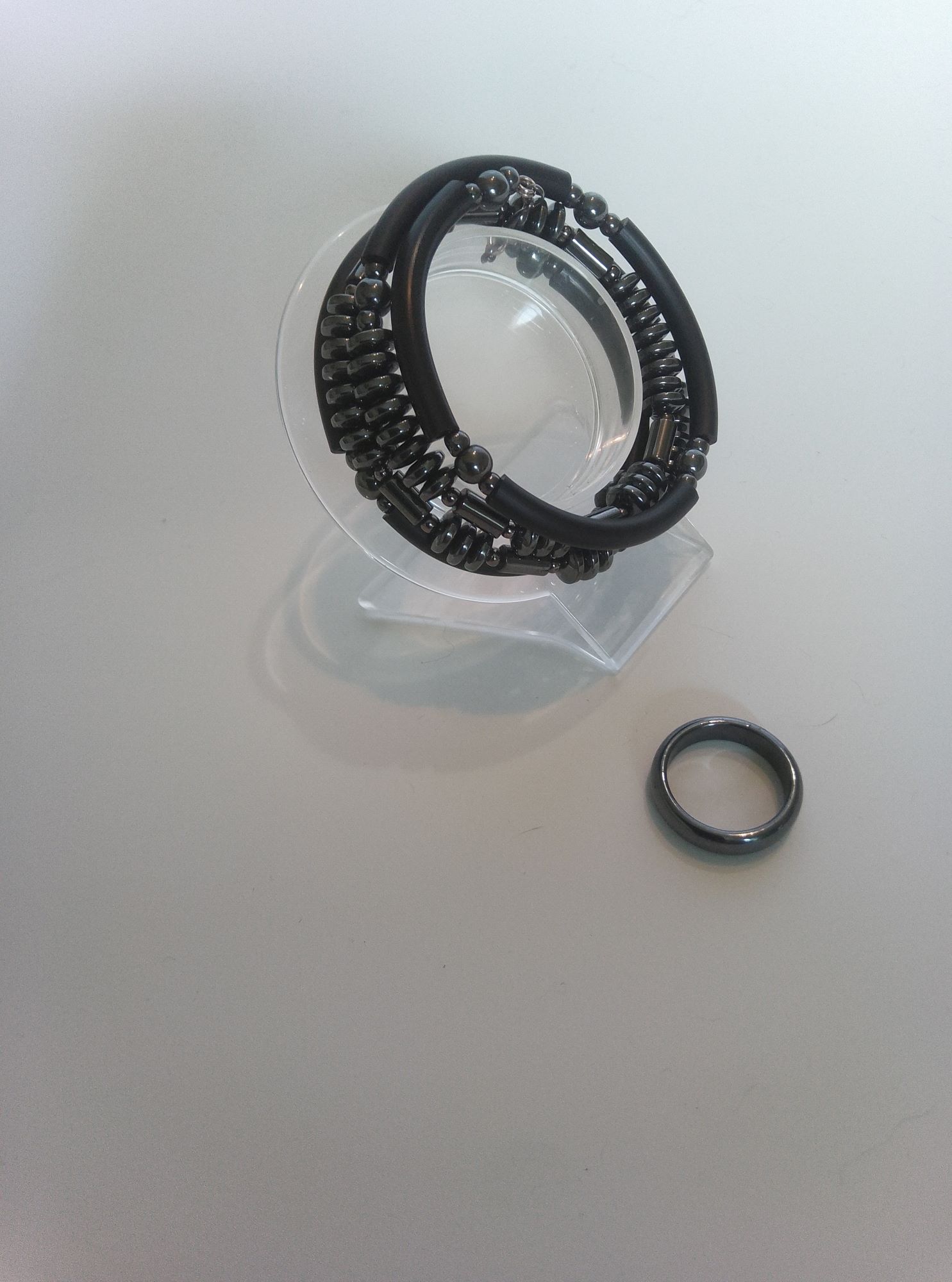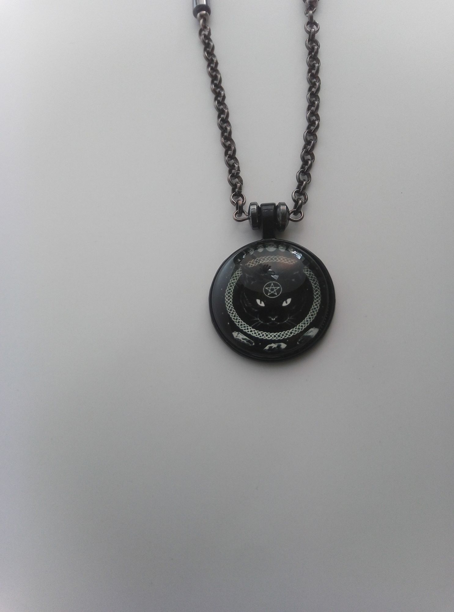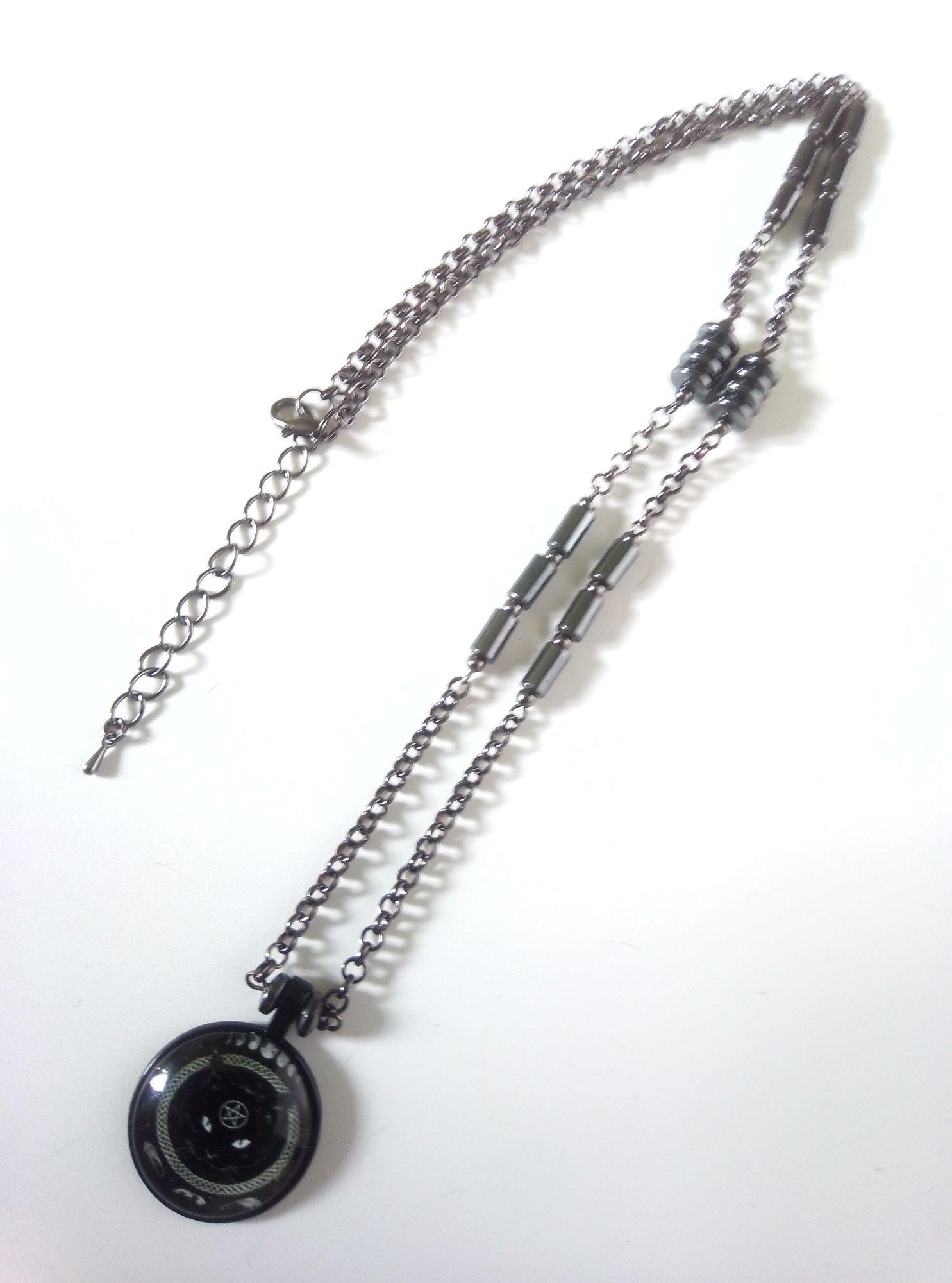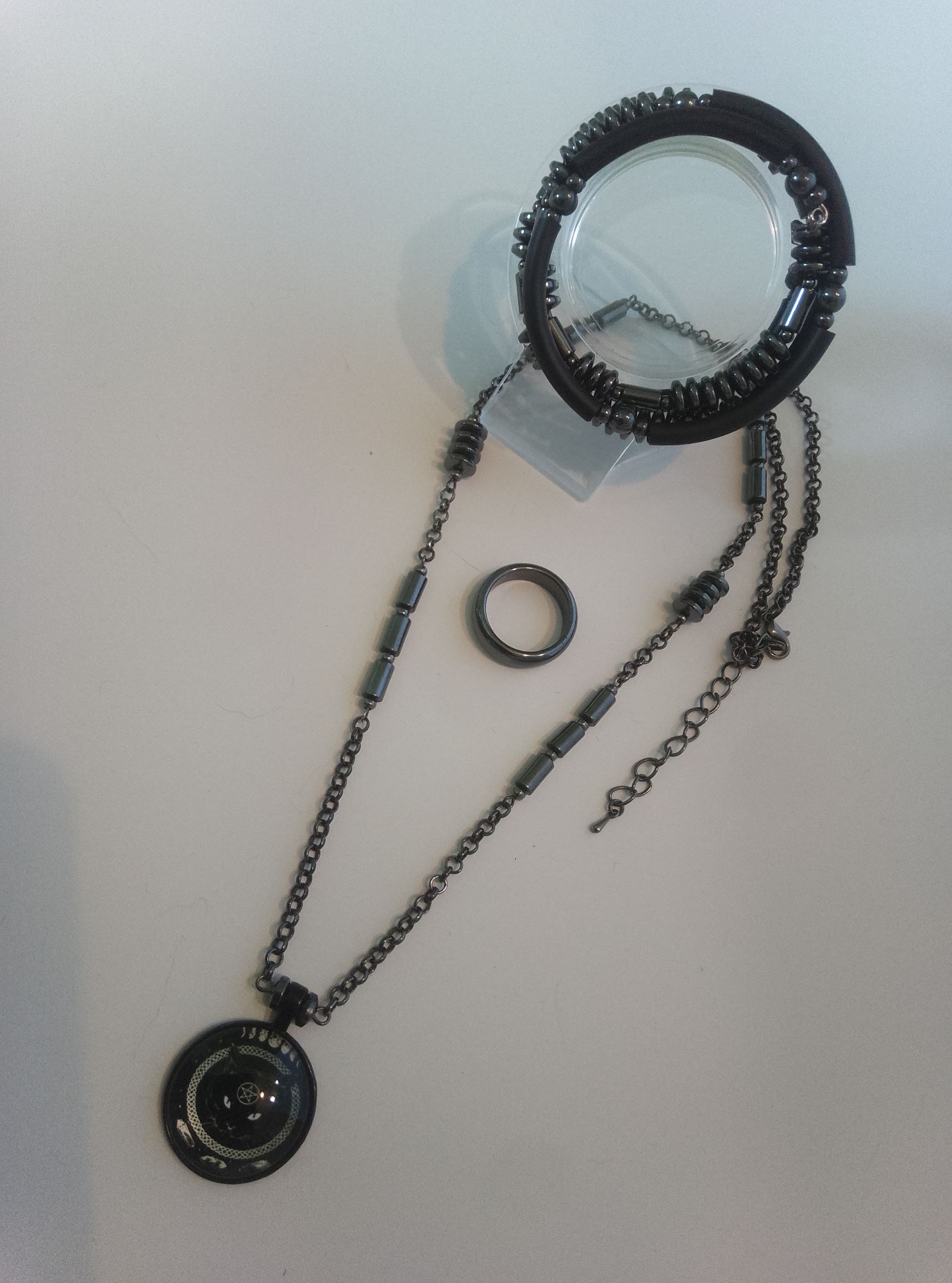 Комплект включає ланцюжок 60 см з подовжувачем та підвіскою “Чорний кіт з пентограмою” діаметром 27 мм, браслет спіральний на меморі-дроті, каблучку з цілісного гематиту розмір від 18 до 21 (при наявності). Матеріал – гематит намистини круглі діаметром 6 мм, диски діаметром 7 мм, циліндри 10х4 мм, шнур ПВХ порожнистий, ювелірний сплав. Фурнітура чорного кольору.