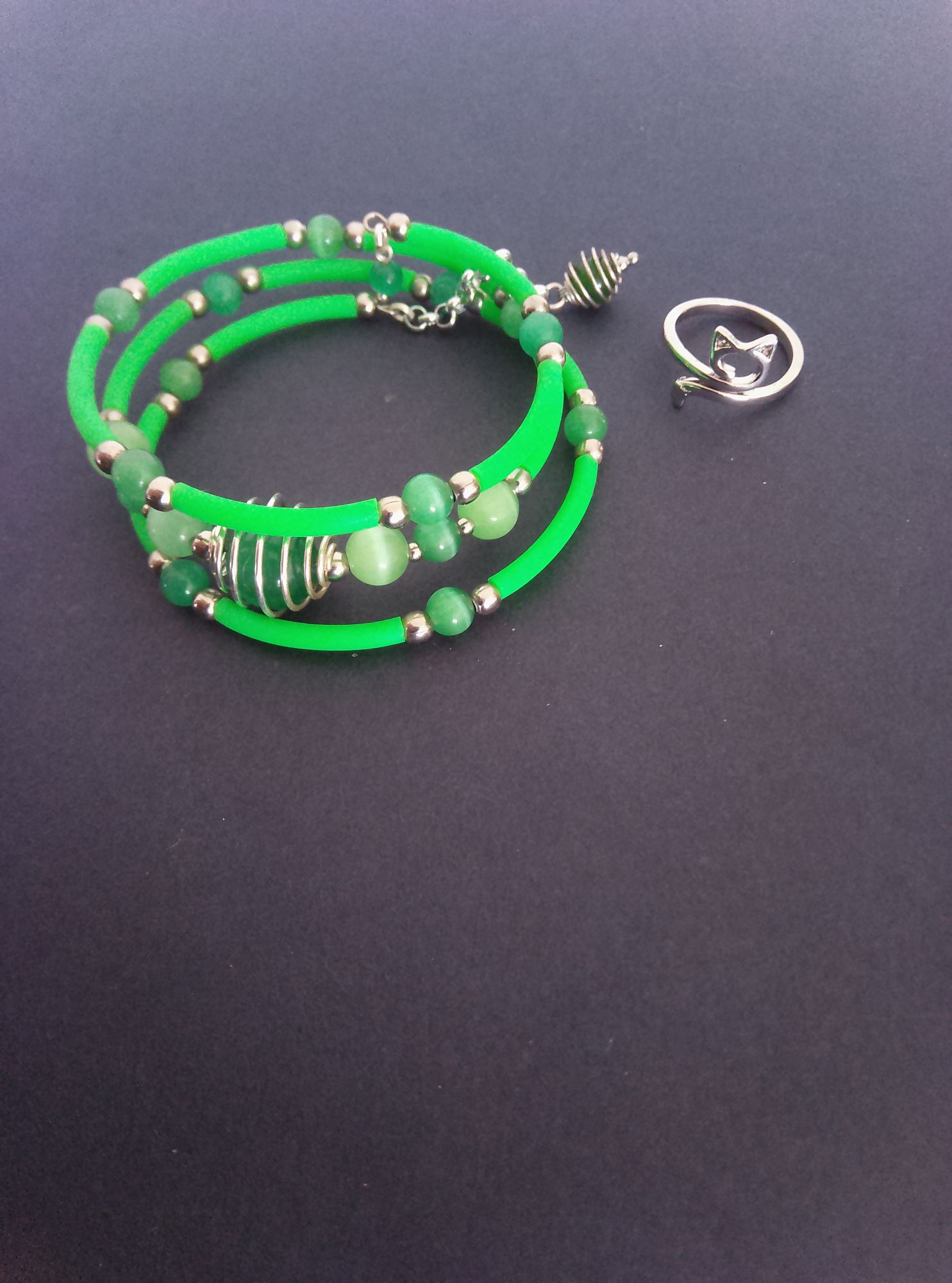 Компект включає чокер з підвіскою 50х20 мм та спіральний браслет на меморі-дроті, сережки пусети 45х15 мм, металеву каблучку регульованого розміру у вигляді кота. Матеріал – котяче око намистини 10, 8 та 6 мм діаметром, метал, шнур ПВХ порожнистий. Фурнітура – сталь нержавіюча, сплав ювелірний сріблястого кольору.