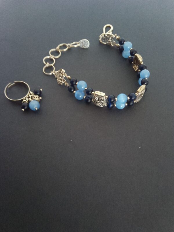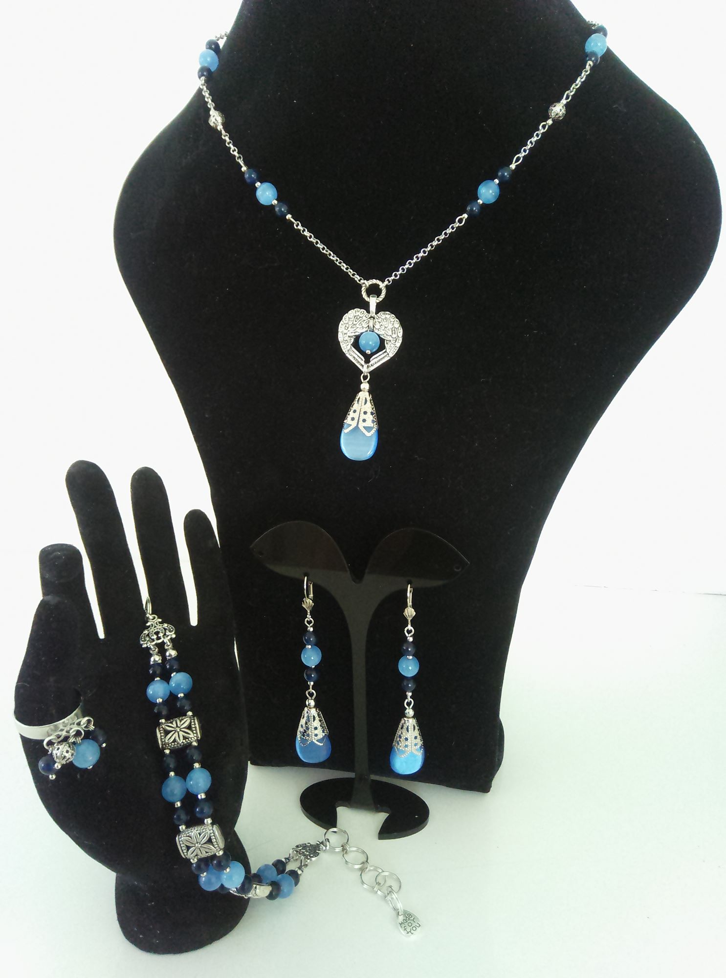 Комплект включає ланцюжок 55 см з підвіскою “Крила янгола” 60х25 мм, подвійний браслет з подовжувачем, сережки 85х13 мм з застібкою-левербек, каблучку регульованого розміру з підвісками. Матеріал – котяче око підвіска та сережки 18х13 мм, намистини круглі 8 та 6 мм діаметром, метал. Фурнітура – сталь нержавіюча, сплав ювелірний сряблястого кольору.