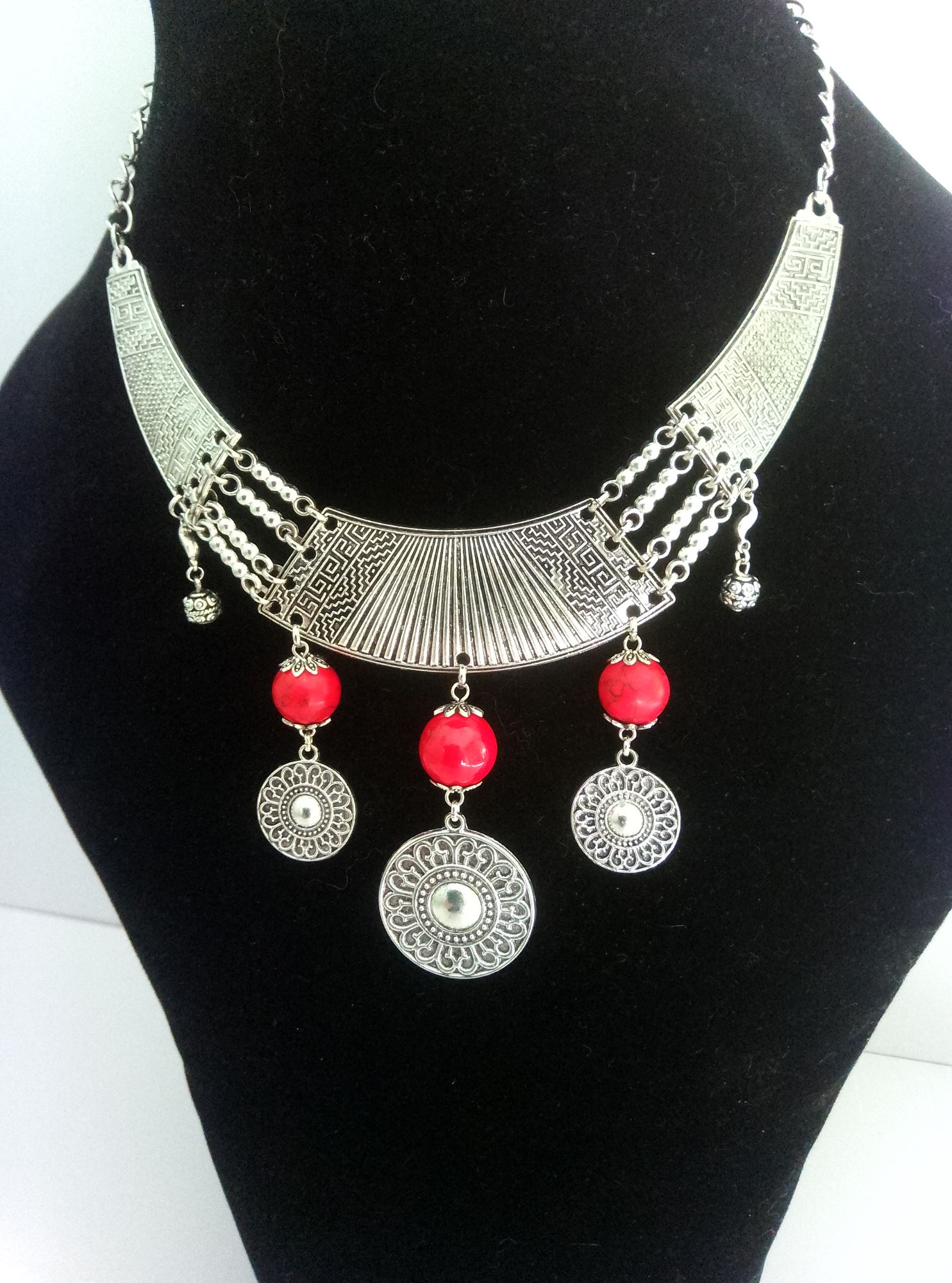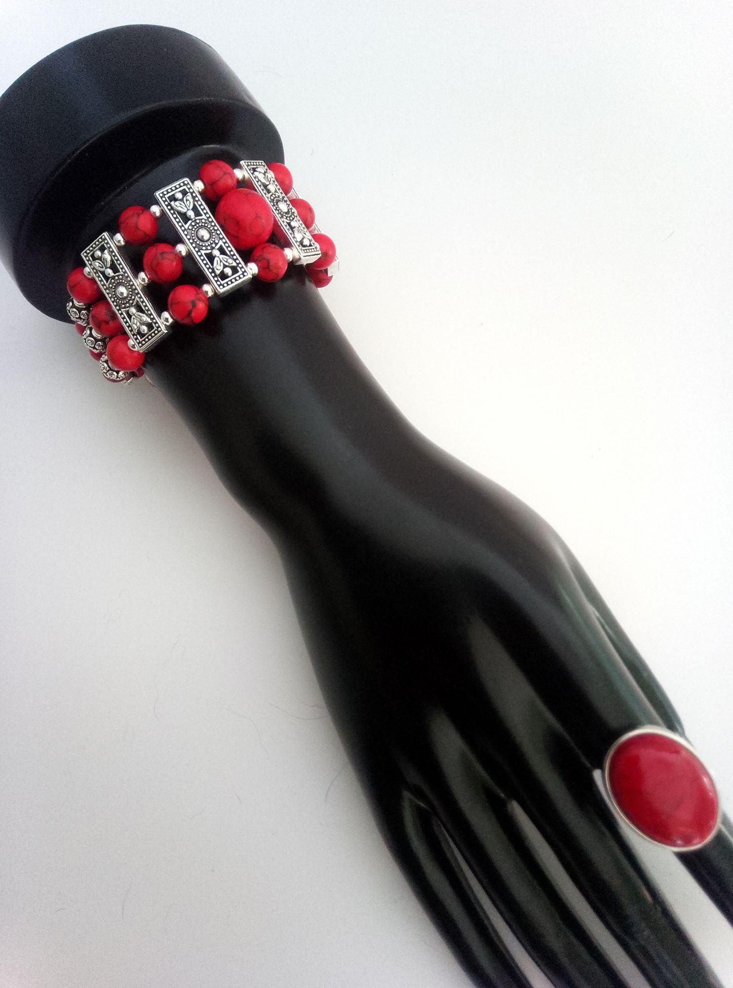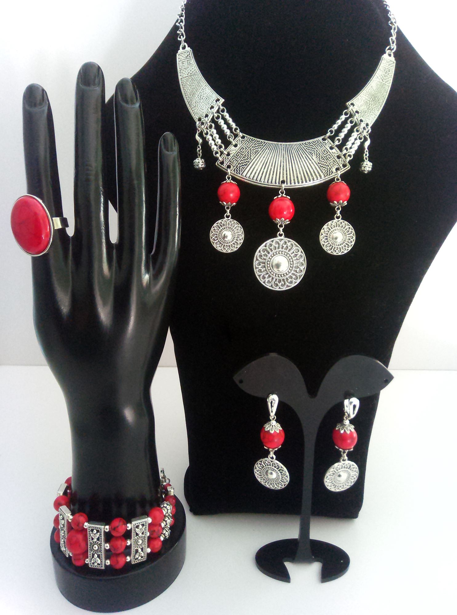 Комплект включає металеве намисто 50 см з підвісками 60х30 мм та 45х20 мм, браслет подвійний з подовжувачем на меморі-дроті, сережки 60х20 мм з англійською застібкою, каблучку регульованого розміру з кабошоном в оправі 27х20 мм. Матеріал – імітація коралу (гауліт) та корал пресований намистини круглі діаметром 14, 12, 8, 6 та 4 мм, кабошон 25х18 мм, сплав ювелірний. Фурнітура сріблястого кольору.