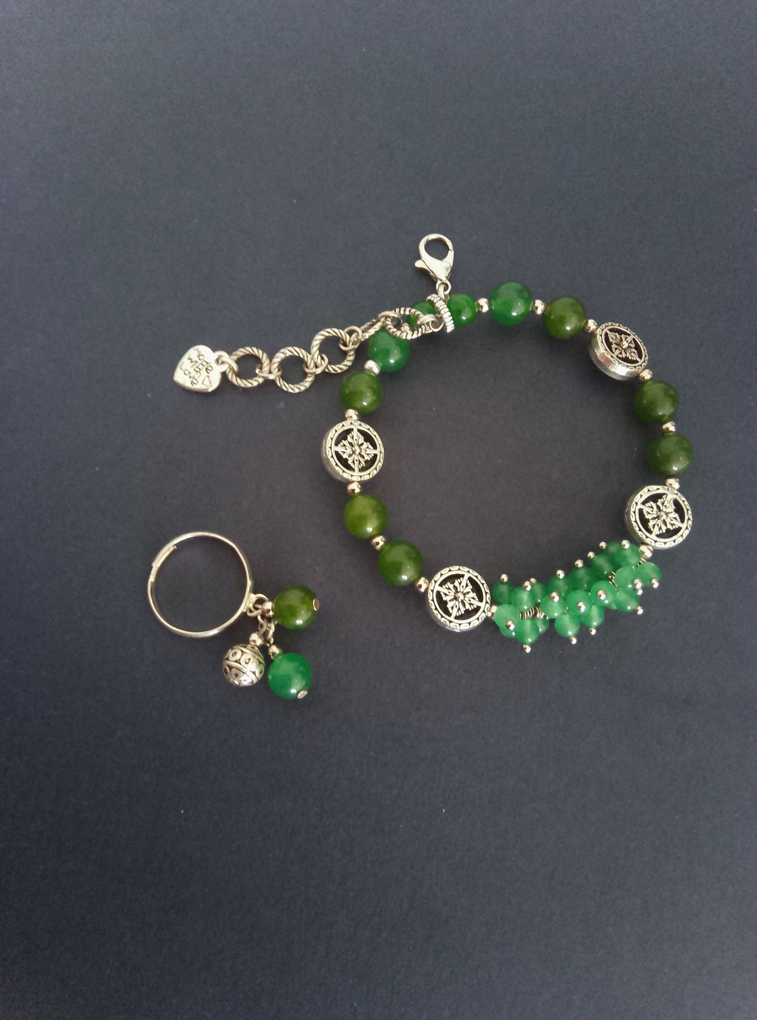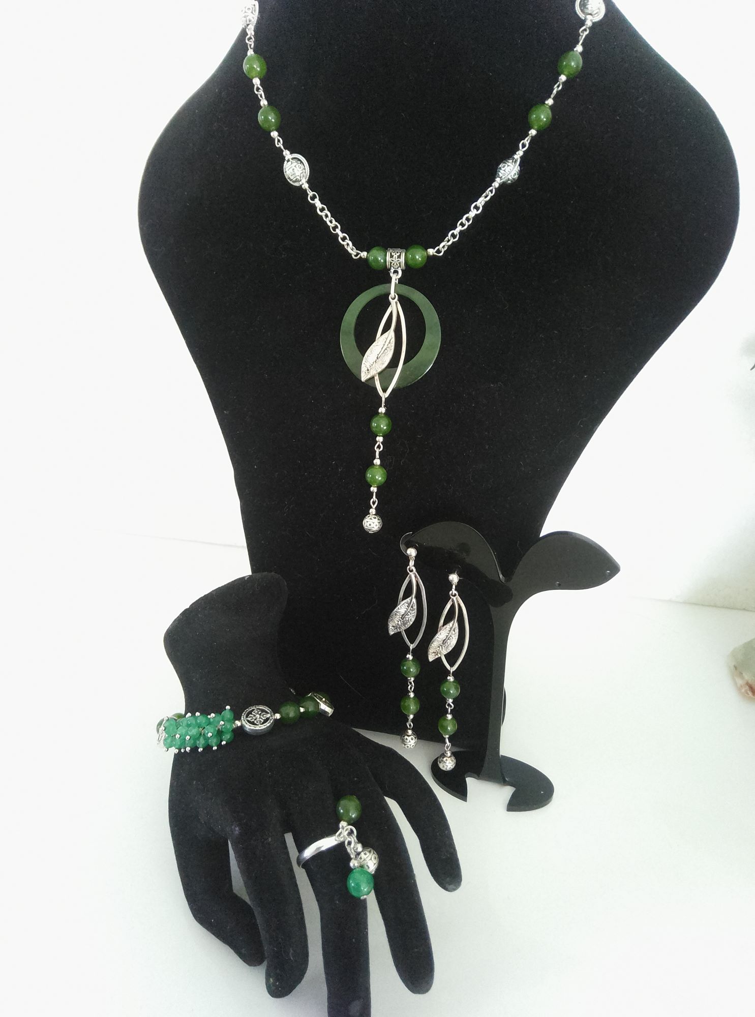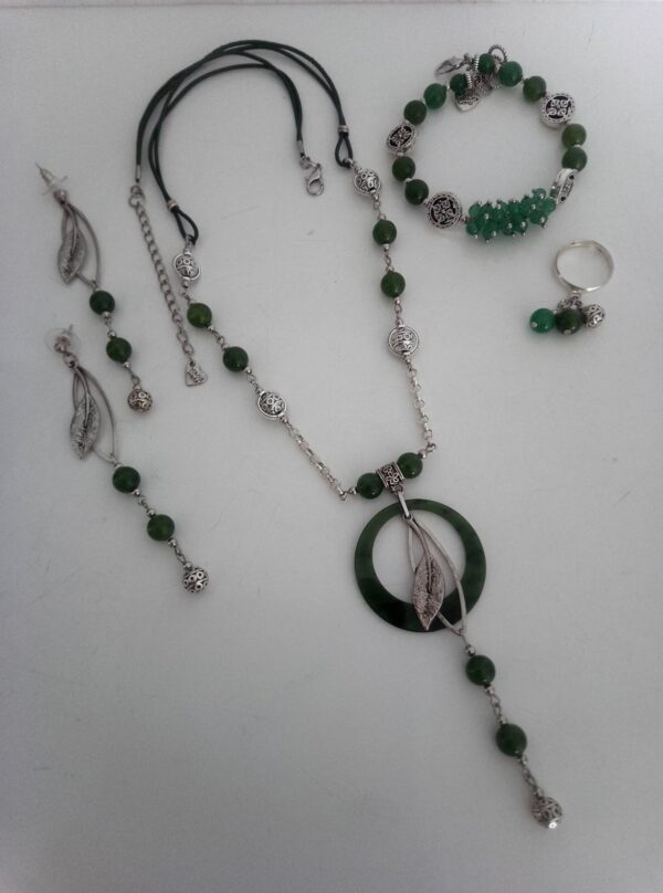 Комплект включає намисто зі шнуром 55 см та підвіскою 100х40 мм, браслет з подовжувачем на меморі-дроті, сережки пусети 100х17 мм, каблучку регульованого розміру з підвісками. Матеріал – нефрит підвіска діаметром 40 мм, намистини діаметром 8, 6 та 4 мм, натуральна шкіра, сплав ювелірний, сталь нержавіюча. Фурнітура срібястого кольору.