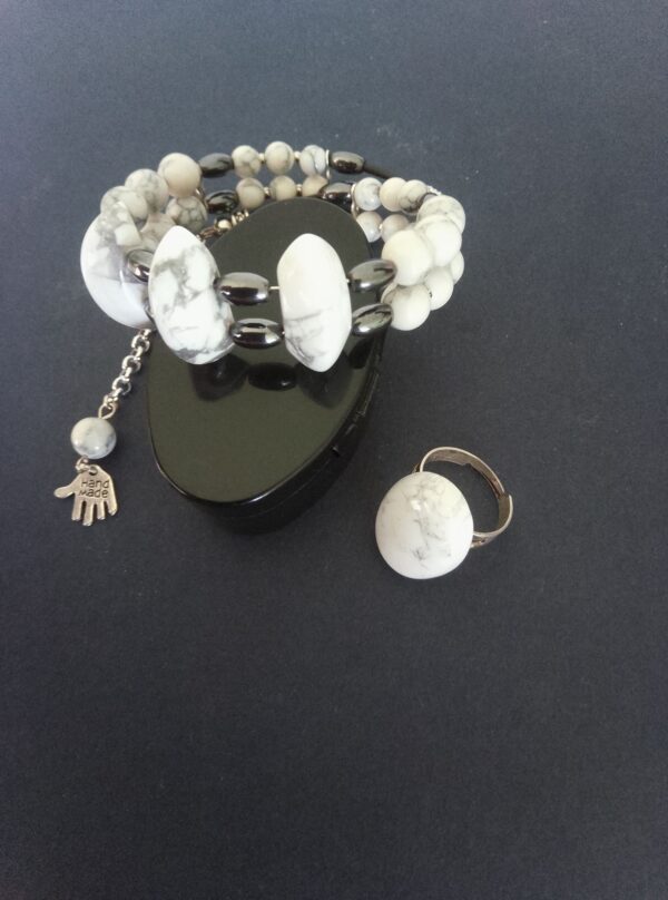 Комплект включає подвійний чокер з підвіскою 110х23 мм та підвійний браслет регульованого розміру на меморі-дроті, сережки 75х15 з застібкою-петля, каблучку регульованого розміру з кабошоном. Матеріал – кахолонг підвіски 30х10 мм, намистини 23х10 мм, діаметром 8 та 6 мм, кабошон 18х25 мм, гематит намистини 8х5 мм, метал, шнур ПВХ порожнистий. Фурнітура – сплав ювелірний сріблястого кольору, сталь нержавіюча.