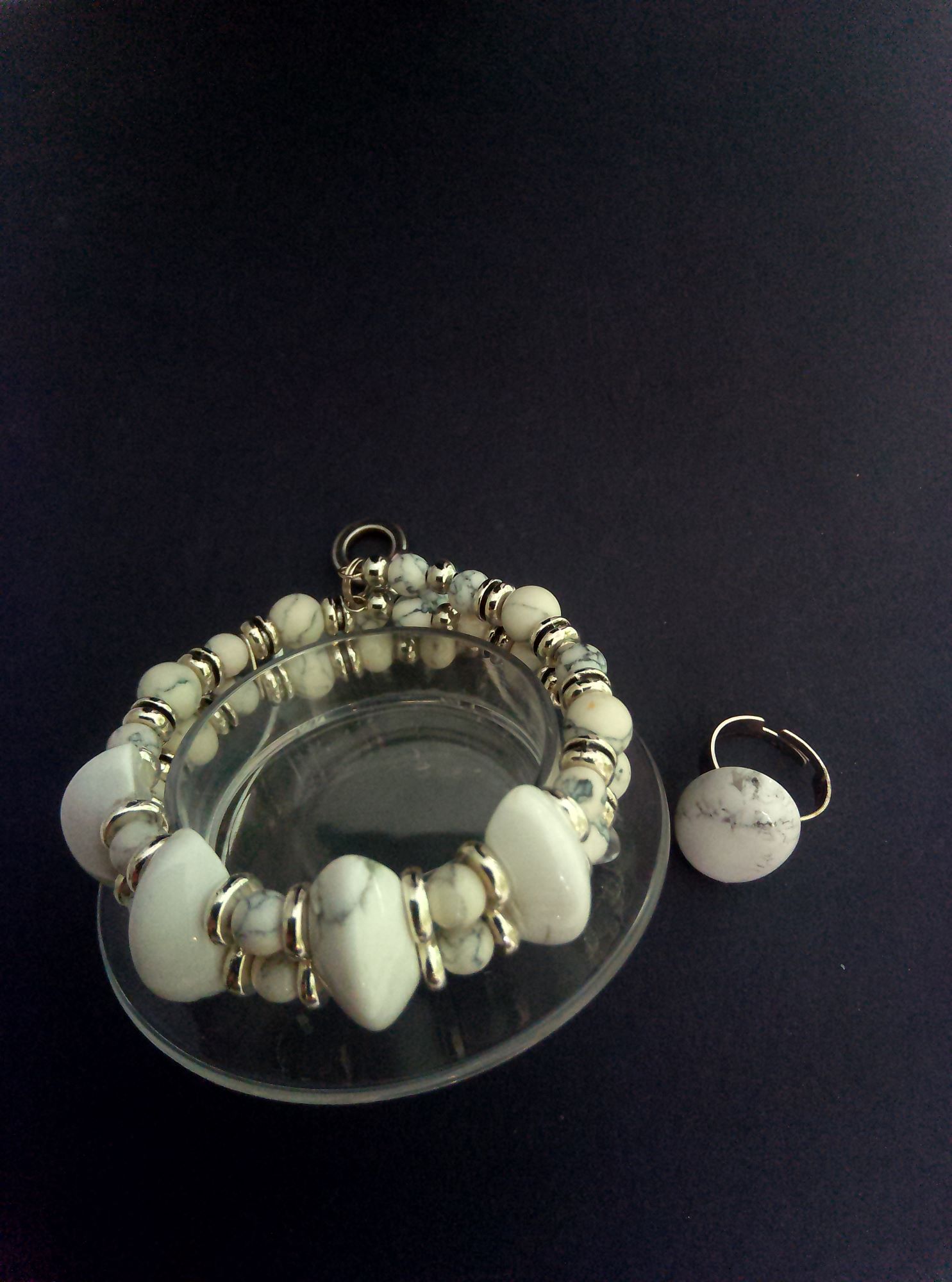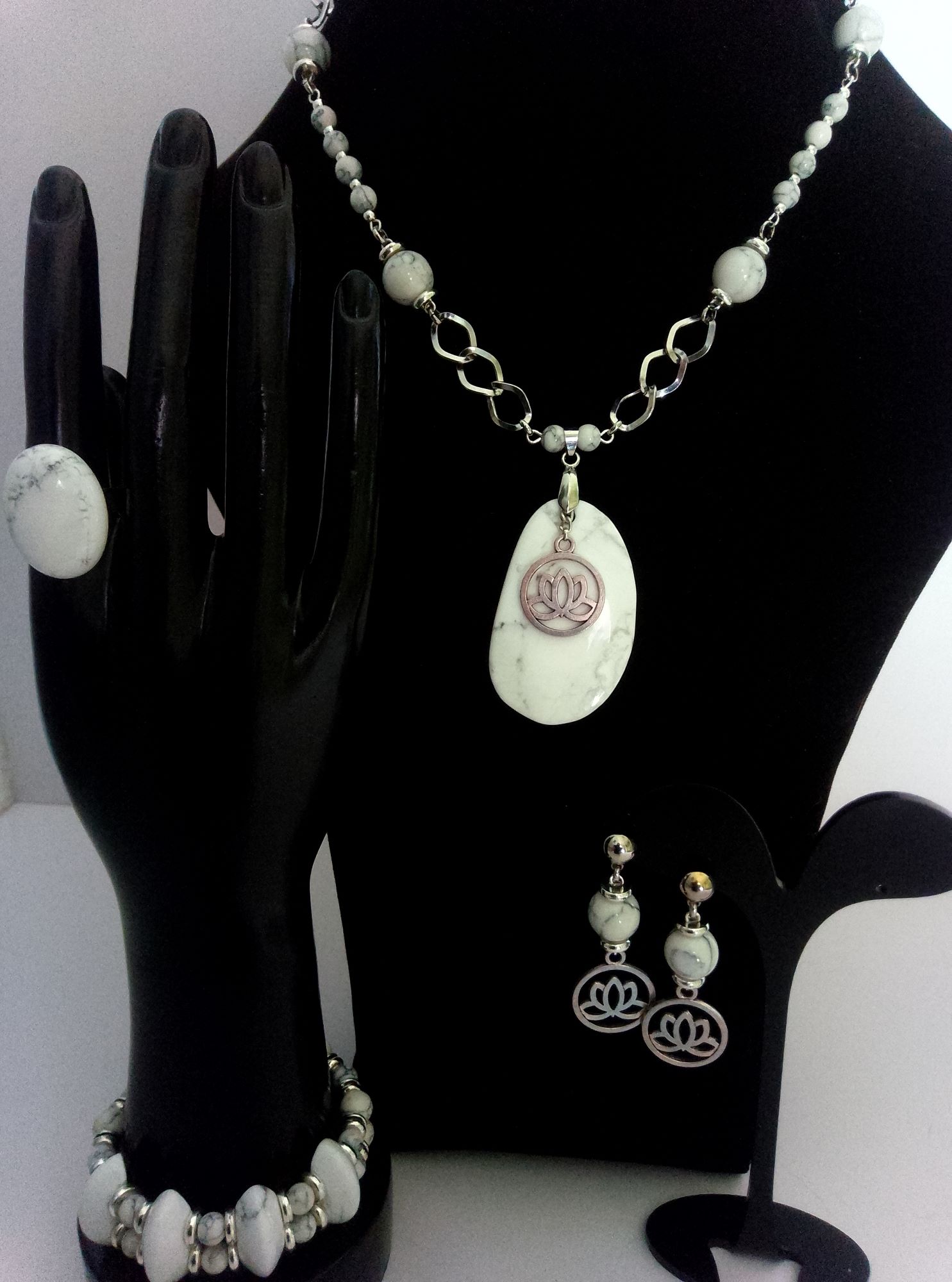 Комплект включає ланцюжок 80 см з намистинами з підвіскою 55х33 мм, браслет подвійний з подовжувачем на меморі-дроті, сережки пусети 55х20 мм, каблучку регульованого розміру з кабошоном. Матеріали – кахолонг підвіска 55х33 мм, намистини 25х10 мм, намистини круглі діаметром 12, 8 та 6 мм, кабошон 25х18 мм, сталь нержавіяча, сплав ювелірний. Фурнітура сріблястого кольору.