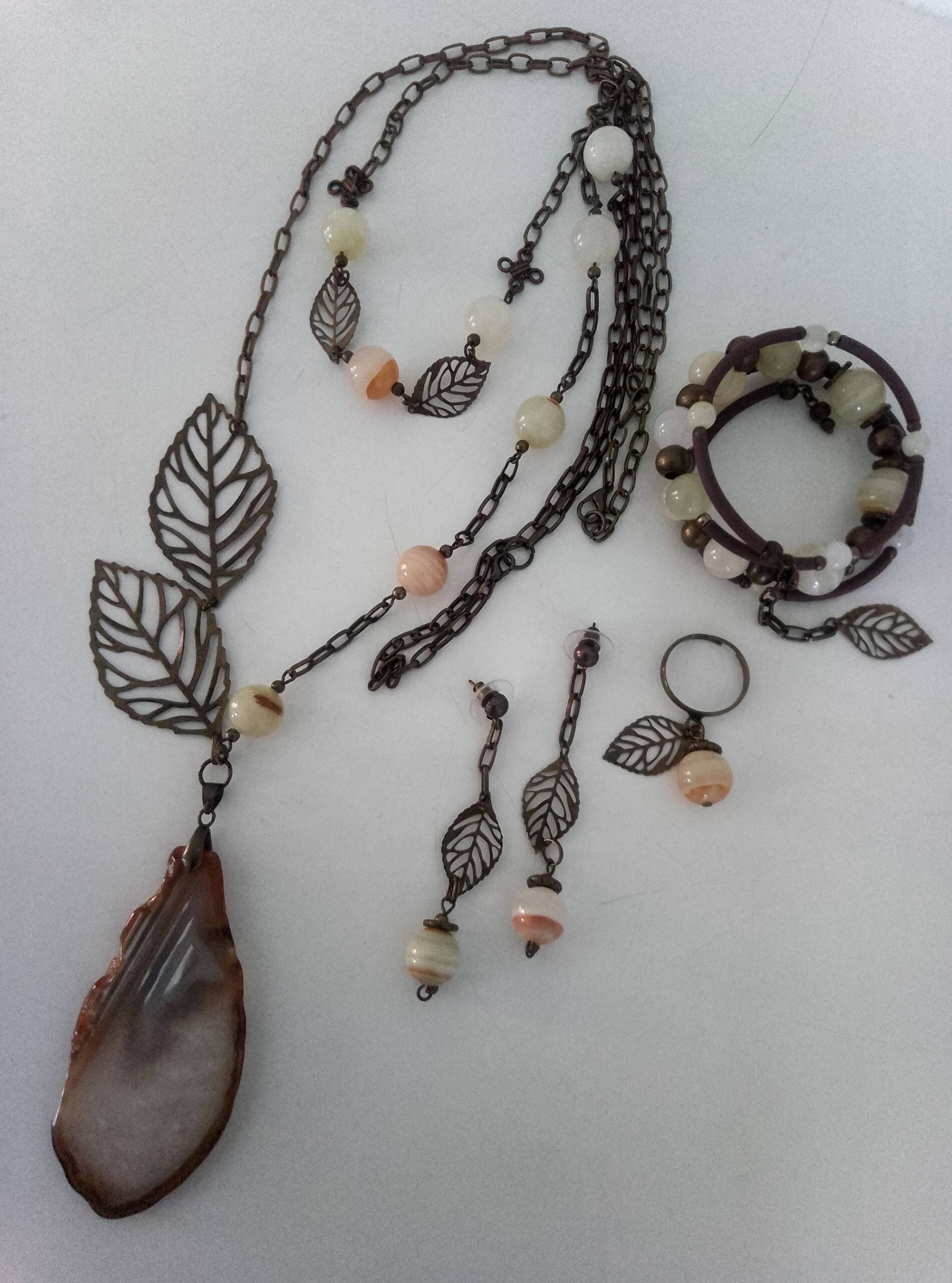 Комплект включає ланцюжок-намисто 85 см з підвіскою зріз 40х100 мм, спіральний браслет на меморі-дроті, сережки пусети 75х14 мм, каблучку регульованого розміру з підвісками. Матеріал – онікс намистини 12, 10 та 6 мм діаметром, метал. шнур ПВХ порожнистий. Фурнітура – сплав ювелірний бронзового кольору.
