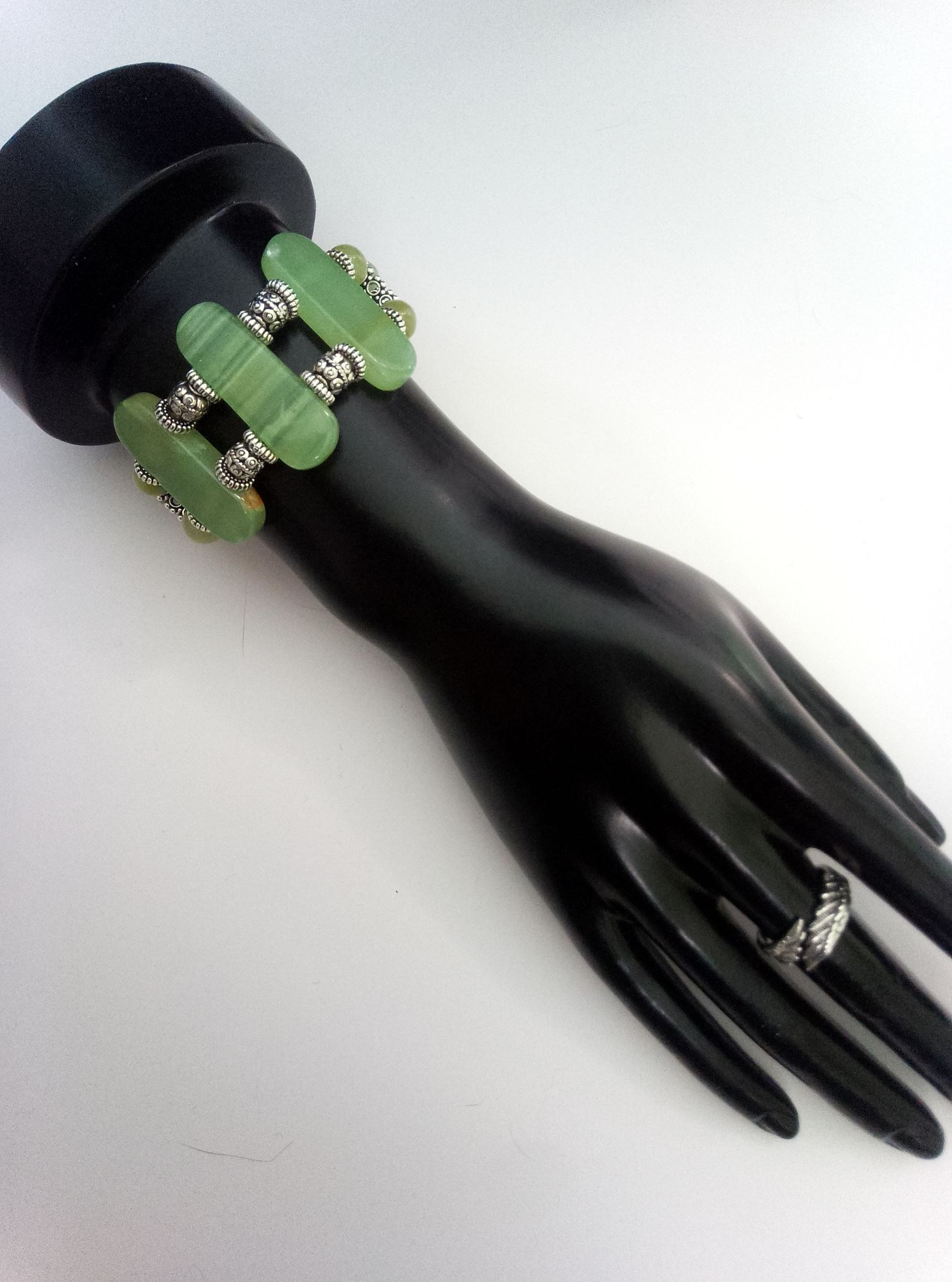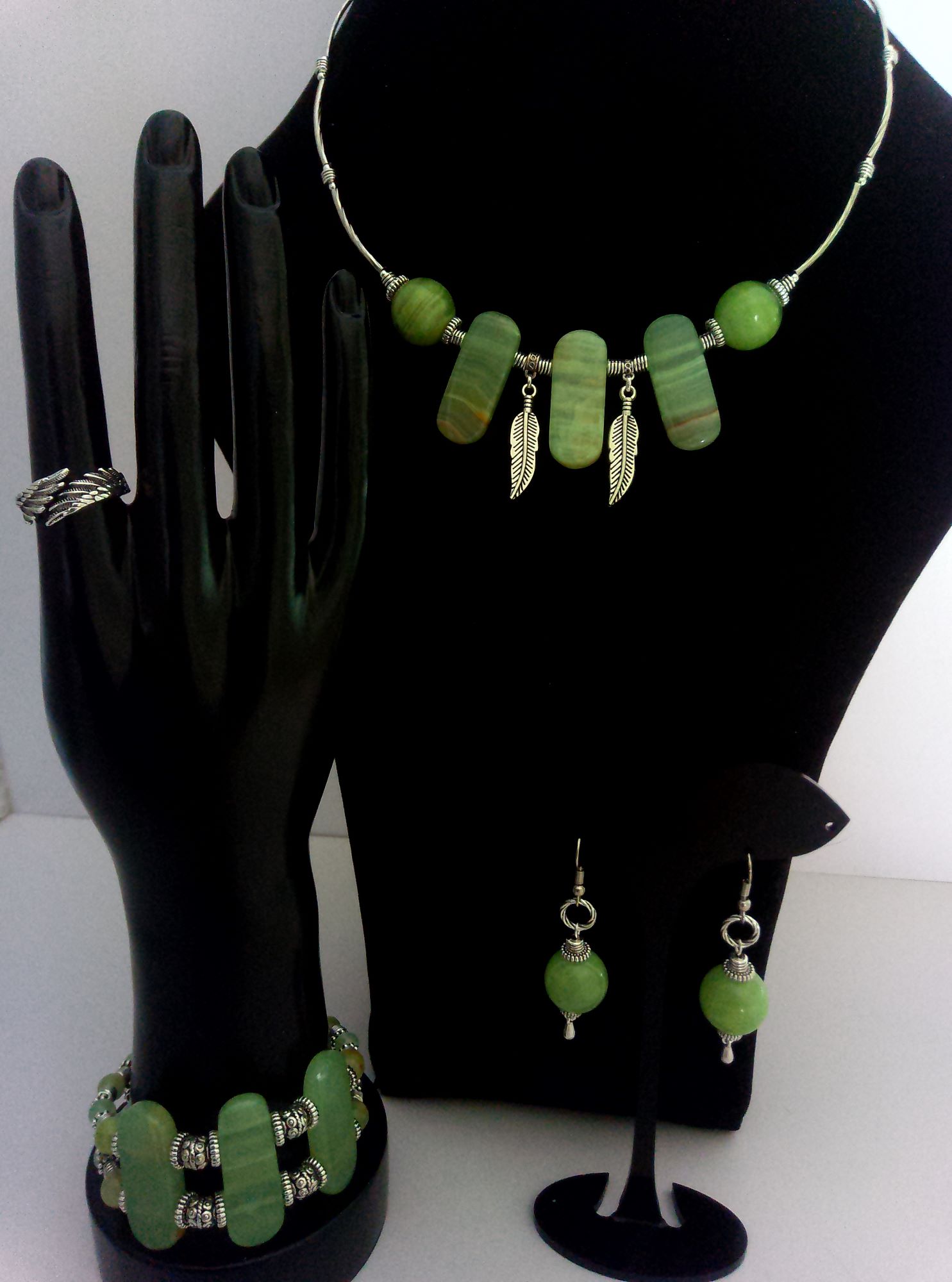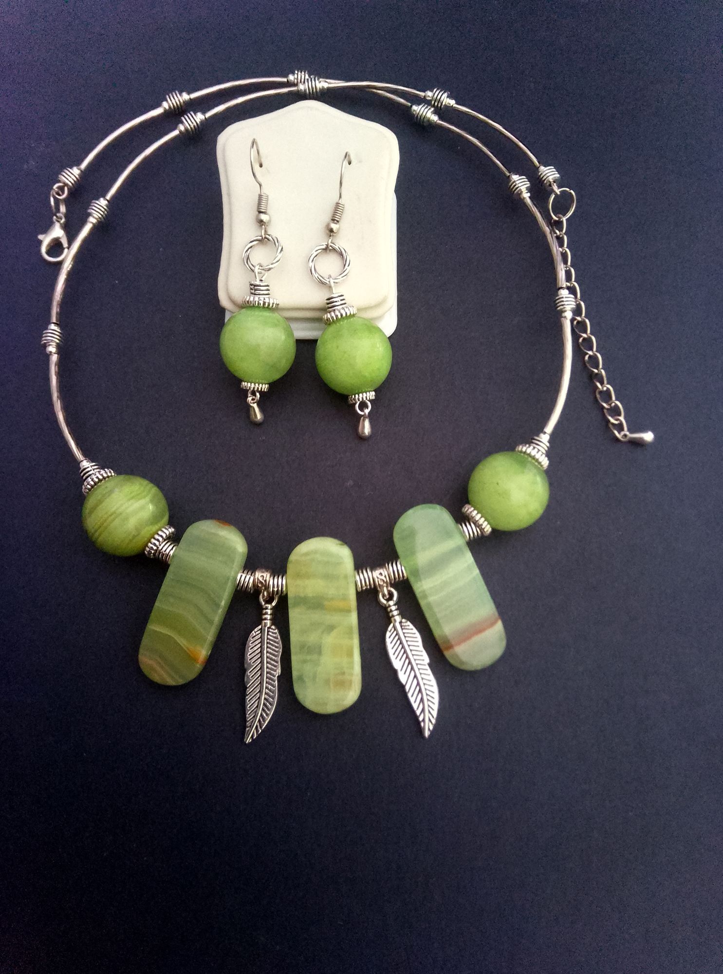 Комплект включає чокер з намистинами та металевими підвісками на меморі-дроті, браслет подвійний з подовжувачем на меморі-дроті, сережки 60х16 мм з застібкою петля, каблучку металеву регульованого розміру. Матеріал – онікс натуральний намистини 35х12 мм, намистини круглі діаметром 16, 8, 6 та 4 мм, сталь нержавіюча, сплав ювелірний. Фурнітура сріблястого кольору.