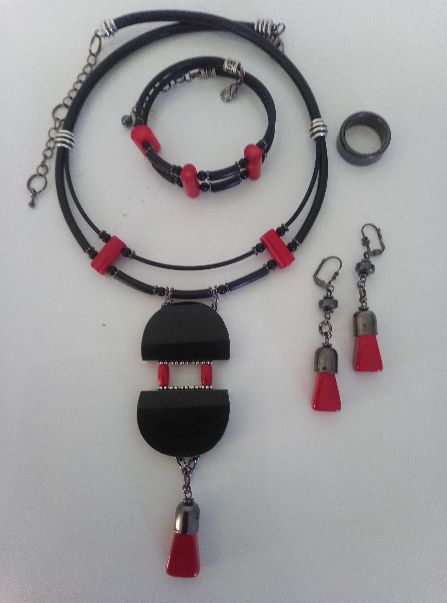 Комплект включає подвійний чокер з підвіскою 40х120 мм, подвійний браслет з подовжувачем, сережки 70 мм з застібкою-левербек, каблучку з цілісного гематиту розмір 18-19. Матеріал – ріг буйвола, корал природний 18х8 мм та 10х5 мм, корал пресований 20х12 мм, гематит 6 мм та 4 мм діаметром, диски 8 мм, агат 4 мм, метал, шнур ПВХ порожнистий. Фурнітура – сплав ювелірний сріблястого та чорного кольору.