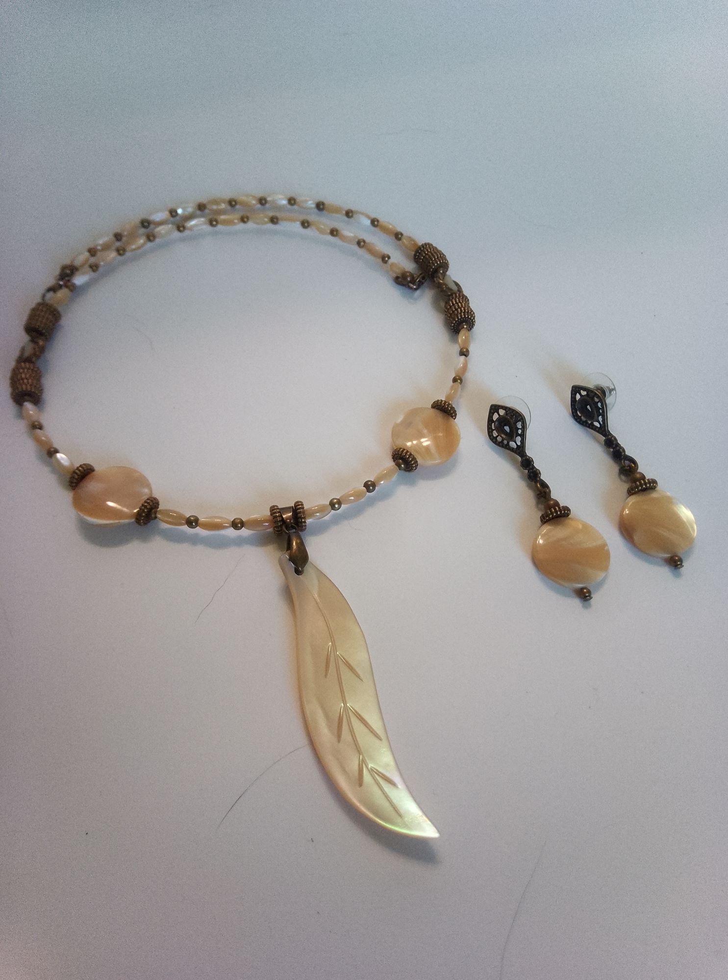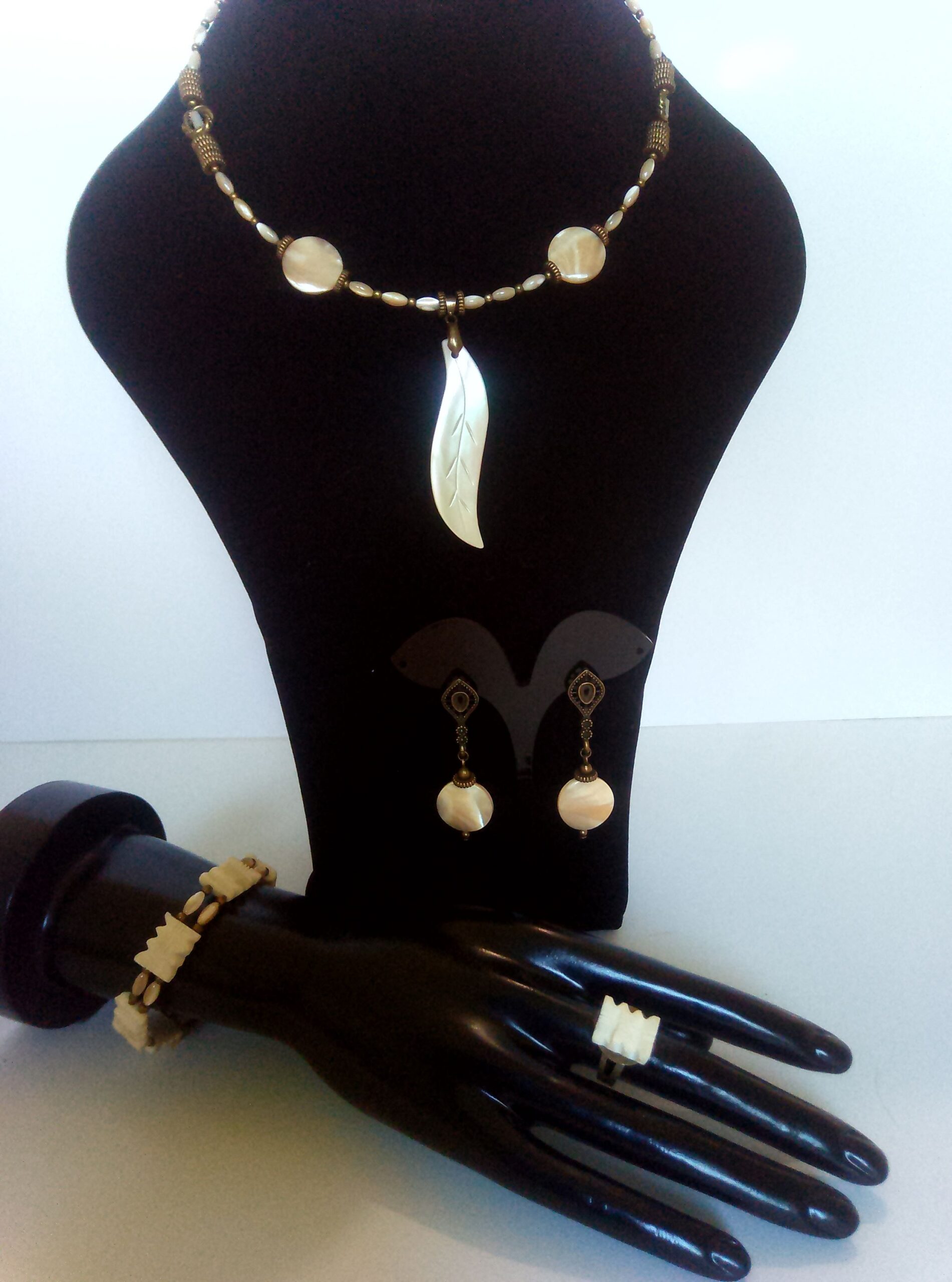 Комплект включает чокер з підвіскою 75х18 мм та подвійний браслет з подовжувачем на меморі-дроті, сережки пусети 60х18 мм, каблучку регульованого розміру. Матеріал – перламутр натуральний намистини диски діаметром 18 мм та намистини “рис” 8х4 мм, слонова кістка намистини 15х12 мм, сплав ювелірний. Фурнітура бронзового кольору.