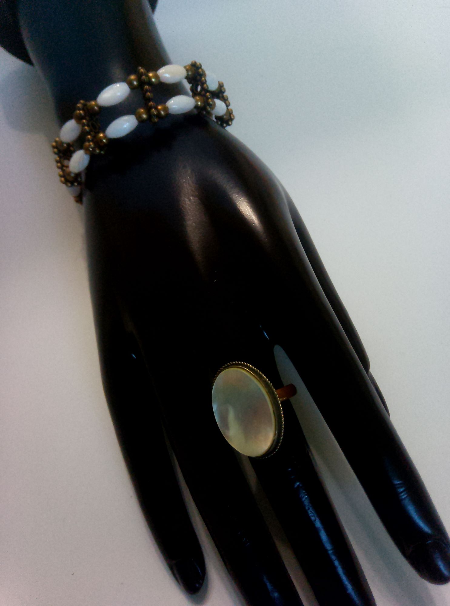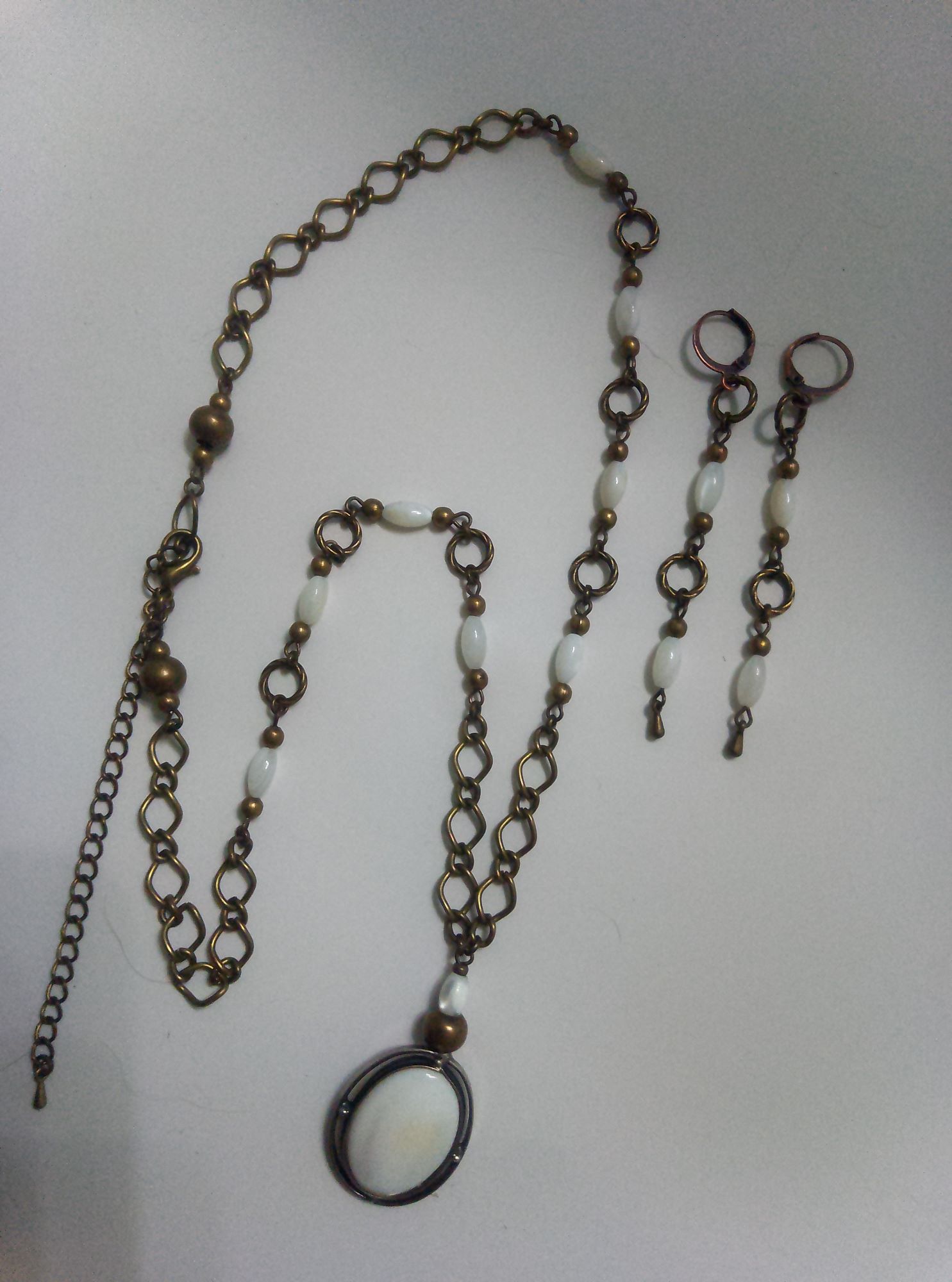 Комплект включає ланцюжок 55 см з намистинами та з подовжувачем, подвійний браслет на меморі-дроті з подовжувачем, сережки 80х9 мм з застібкою левербек, каблучку регульованого розміру з кабошоном в оправі 23х17 мм. Матеріал – перламутр натуральний намистини “рис” 10х5 мм, кабошон в підвісці 25х18 мм, кабошон в каблучці 20х15 мм, сплав ювелірний. Фурнітура бронзового кольору.
