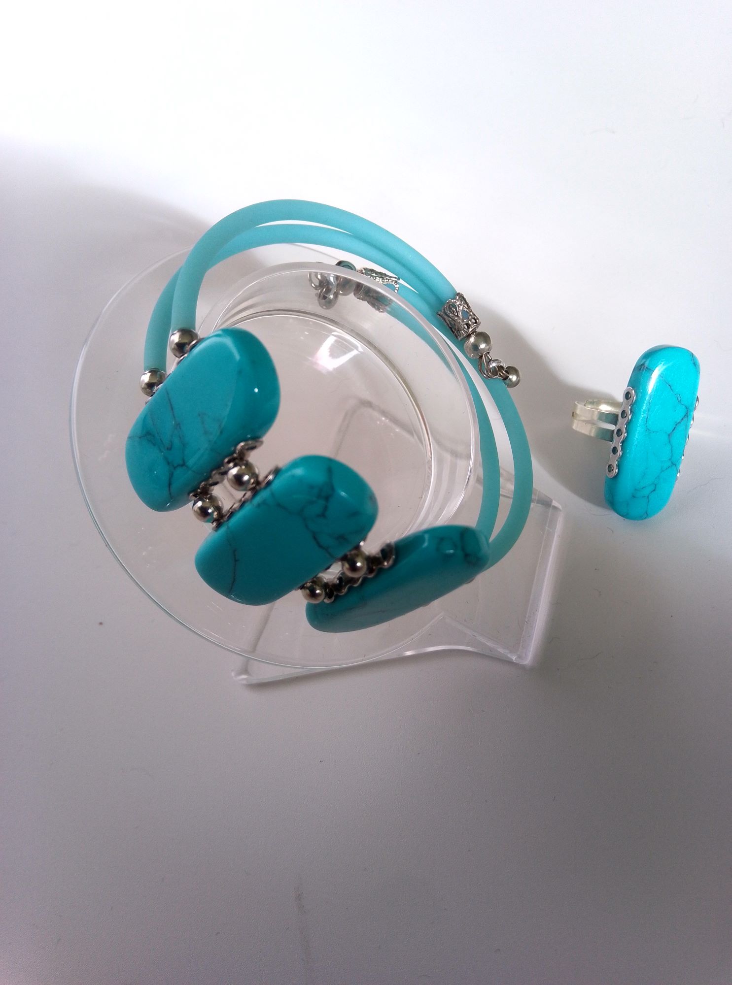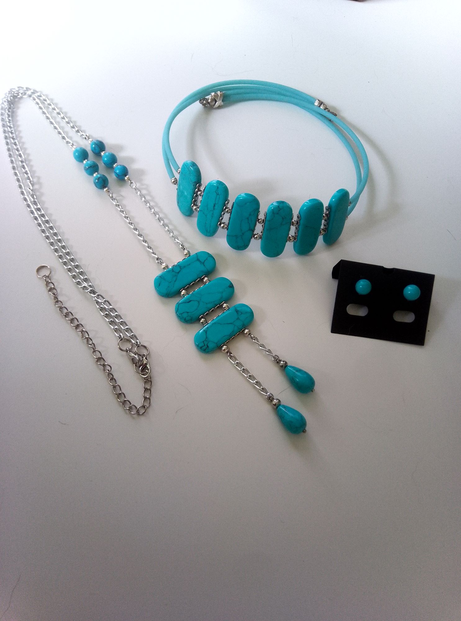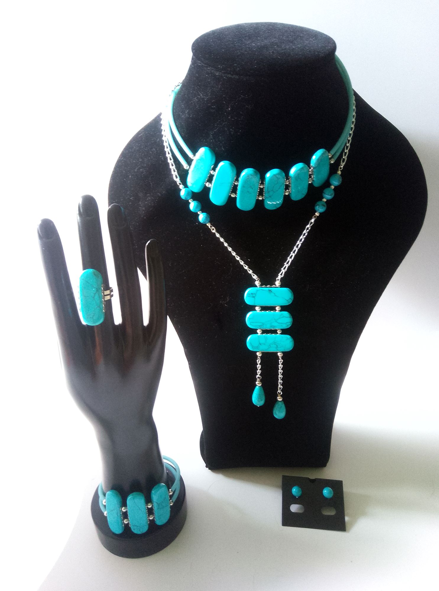 Комплект включає подвійний чокер на меморі-дроті та ланцюжок 70 см з подовжувачем з підвіскою 110х35 мм, браслет подвійний регульованого розміру на меморі-дроті, сережки-пусети діаметром 8 мм, каблучку регульованого розміру з кабошоном. Матеріал – бірюза пресована намистини 35х18 мм, намистини-краплі 15х10 мм, намистини круглі діаметром 8 мм, шнур ПВХ порожнистий, сплав ювелірний, сталь нержавіюча. Фурнітура сріблястого кольору.