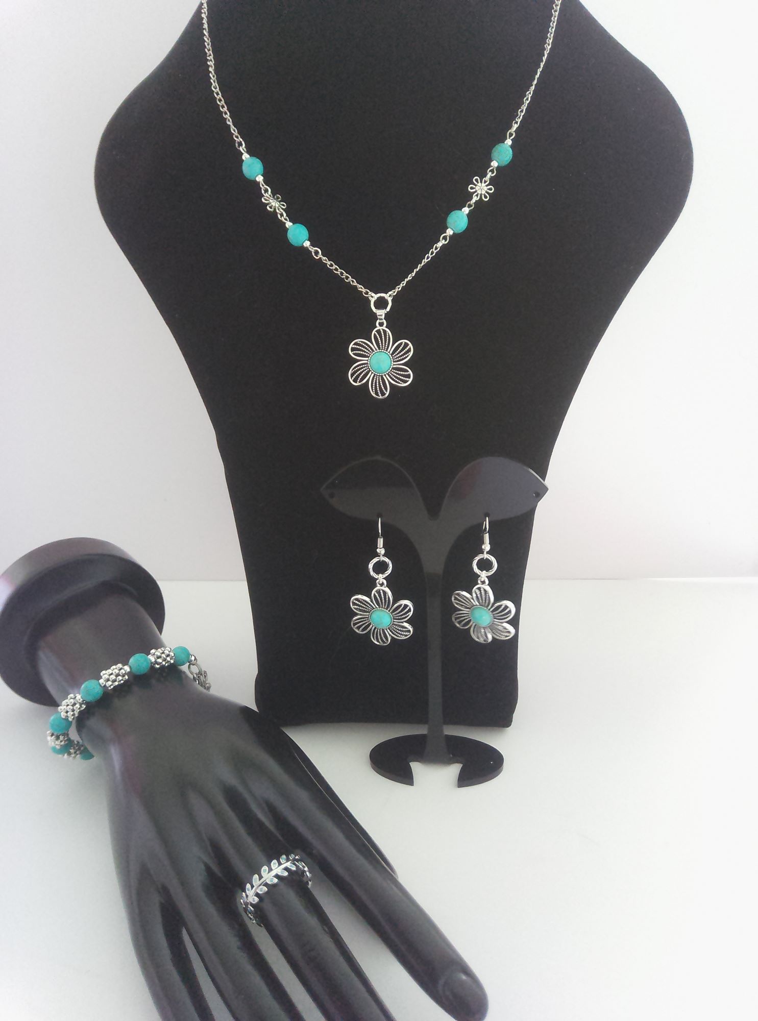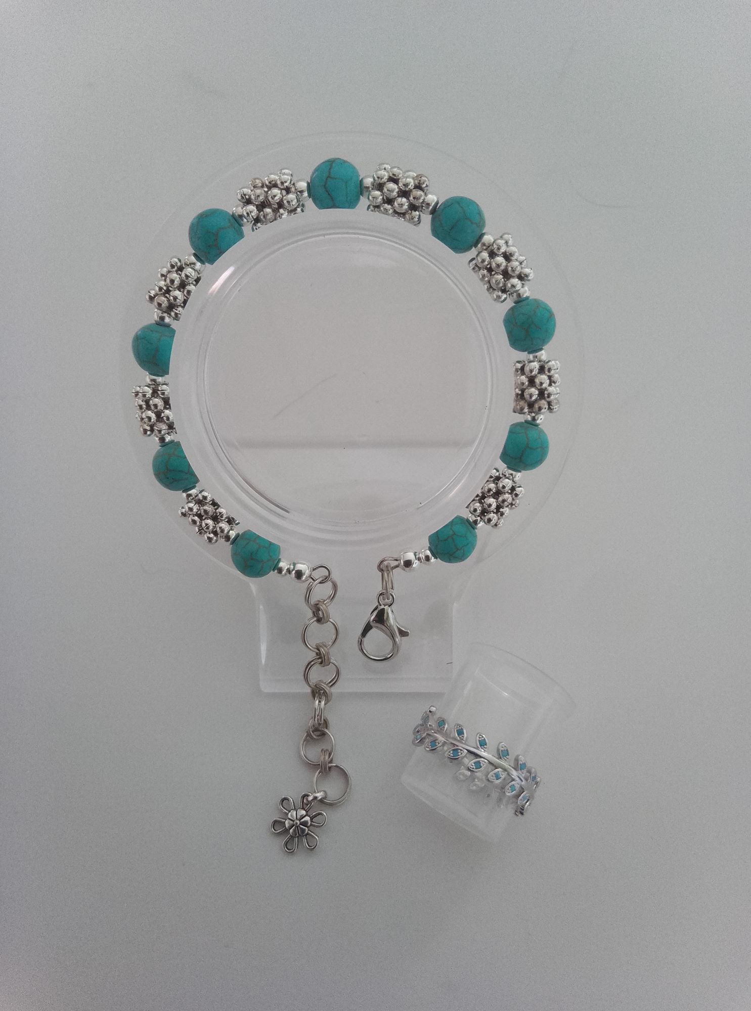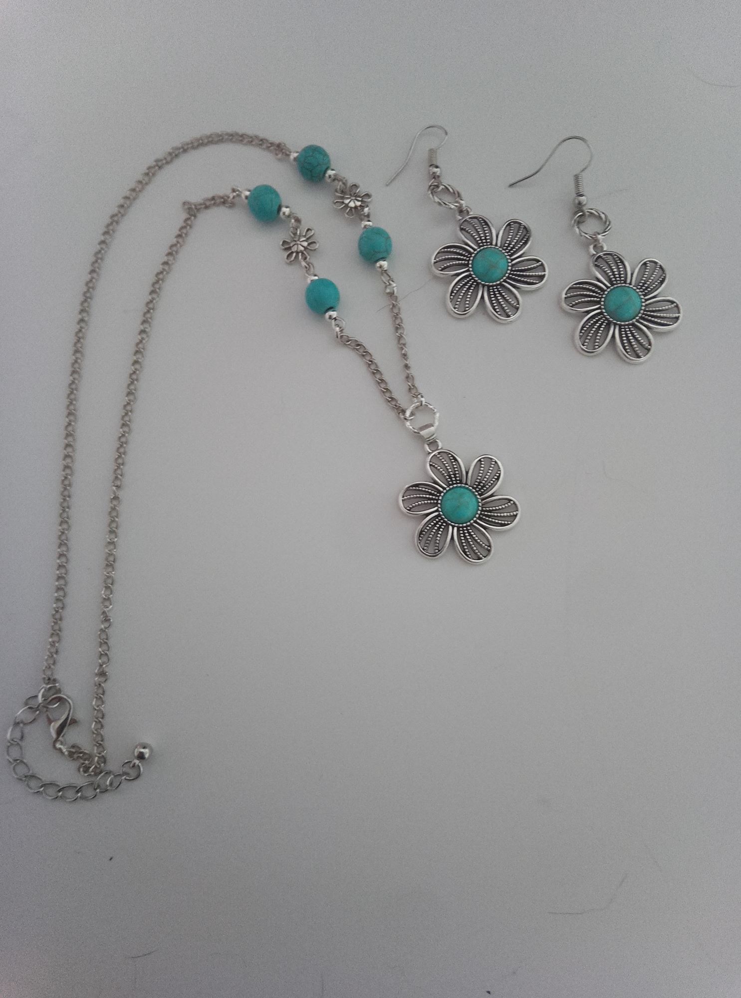 Комплект включає ланцюжок 48 см з намистинами та з підвіскою 25х25 мм, браслет на меморі-дроті з подовжувачем, сережки 55х25 мм, каблучку регульованого розміру. Матеріал – бірюза пресована намистини круглі 8 мм діаметром, кабошони в підвісці і в сережках 8 мм діаметром, сталь нержавіюча, сплав ювелірний. Фурнітура сріблястого кольору.