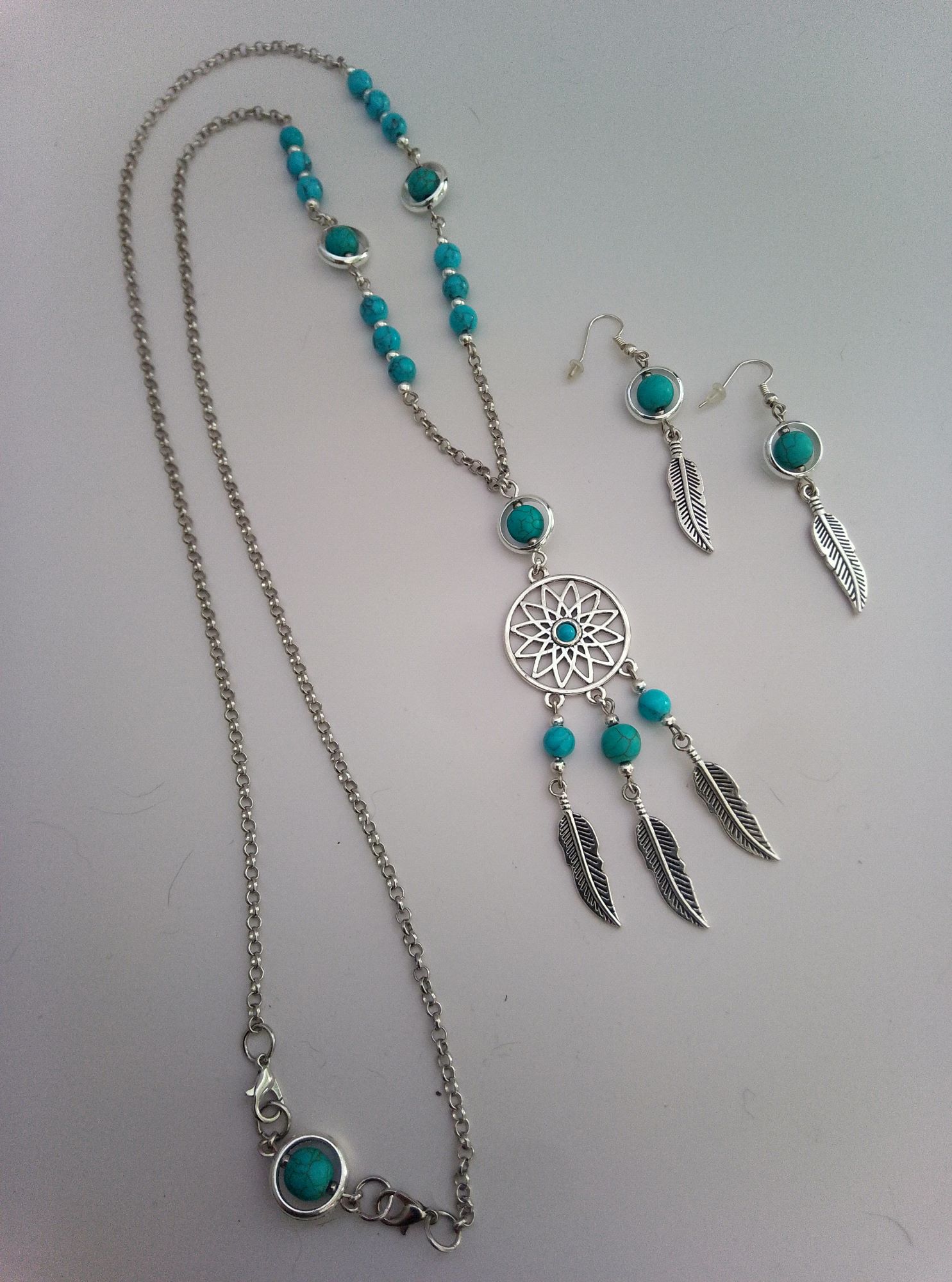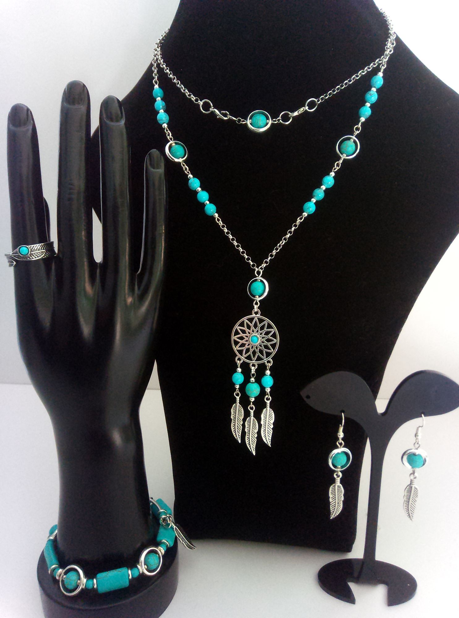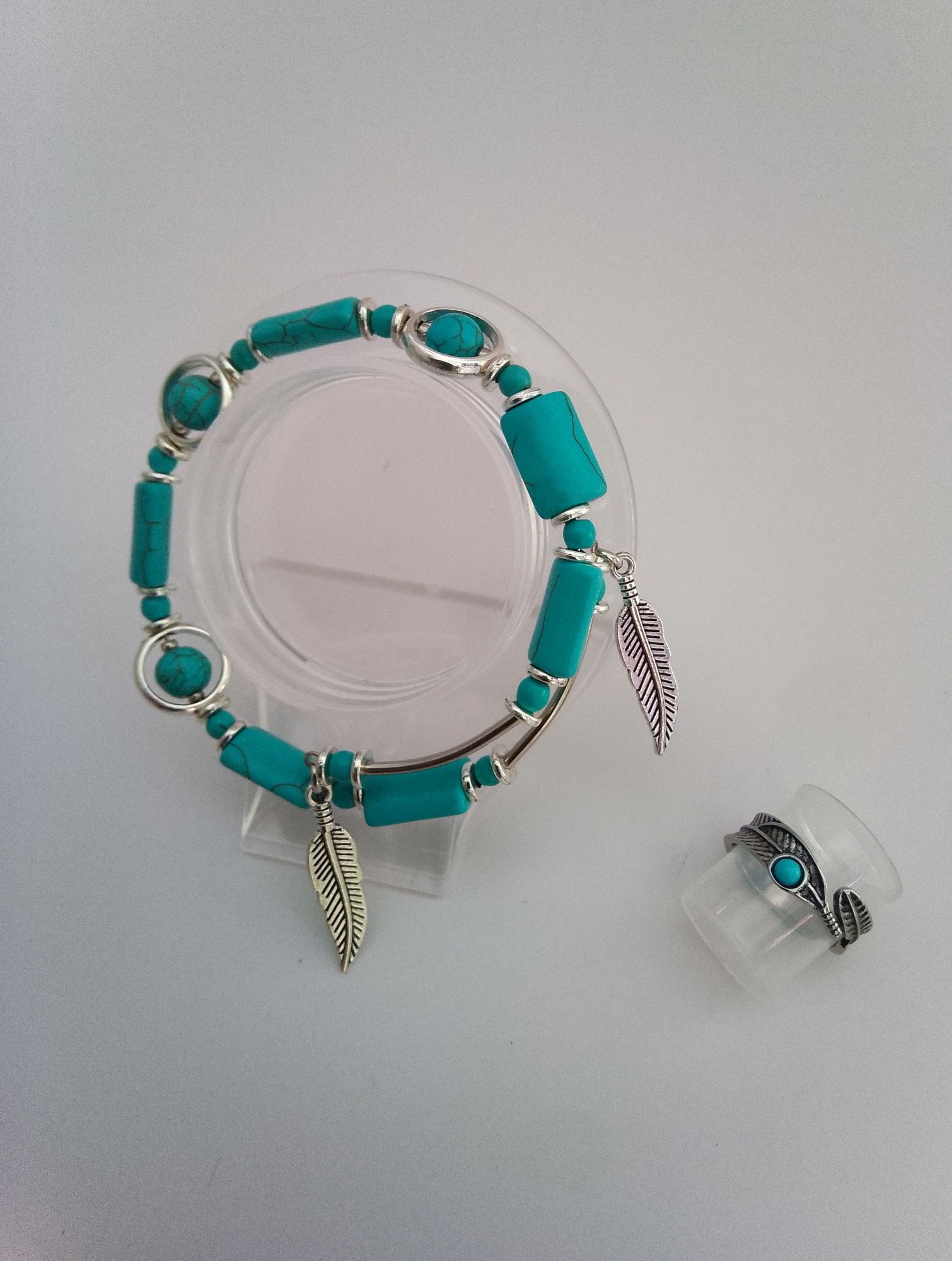 Комплект включає ланцюжок 80 см з намистинами та підвіскою 100х25 мм та декоративним подовжувачем, браслет регульованого розміру на меморі-дроті, сережки 65х12 мм з застібкою петля, каблучку регульованого розміру. Матеріали – бірюза пресована намистини круглі 8, 6 та 4 мм, намистини прямокутні 15х10 мм, сталь нержавіюча, сплав ювелірний. Фурнітура сріблястого кольору.