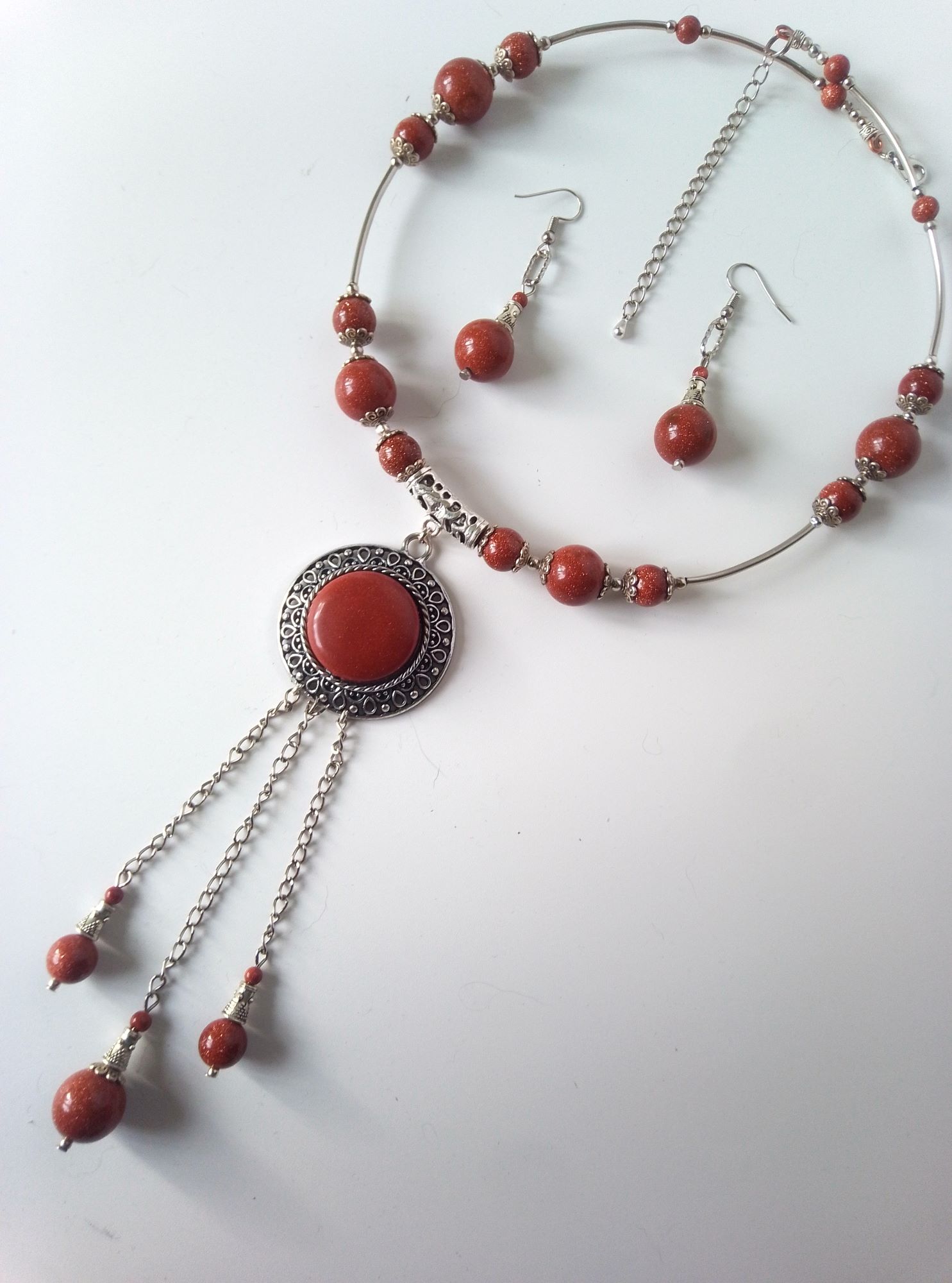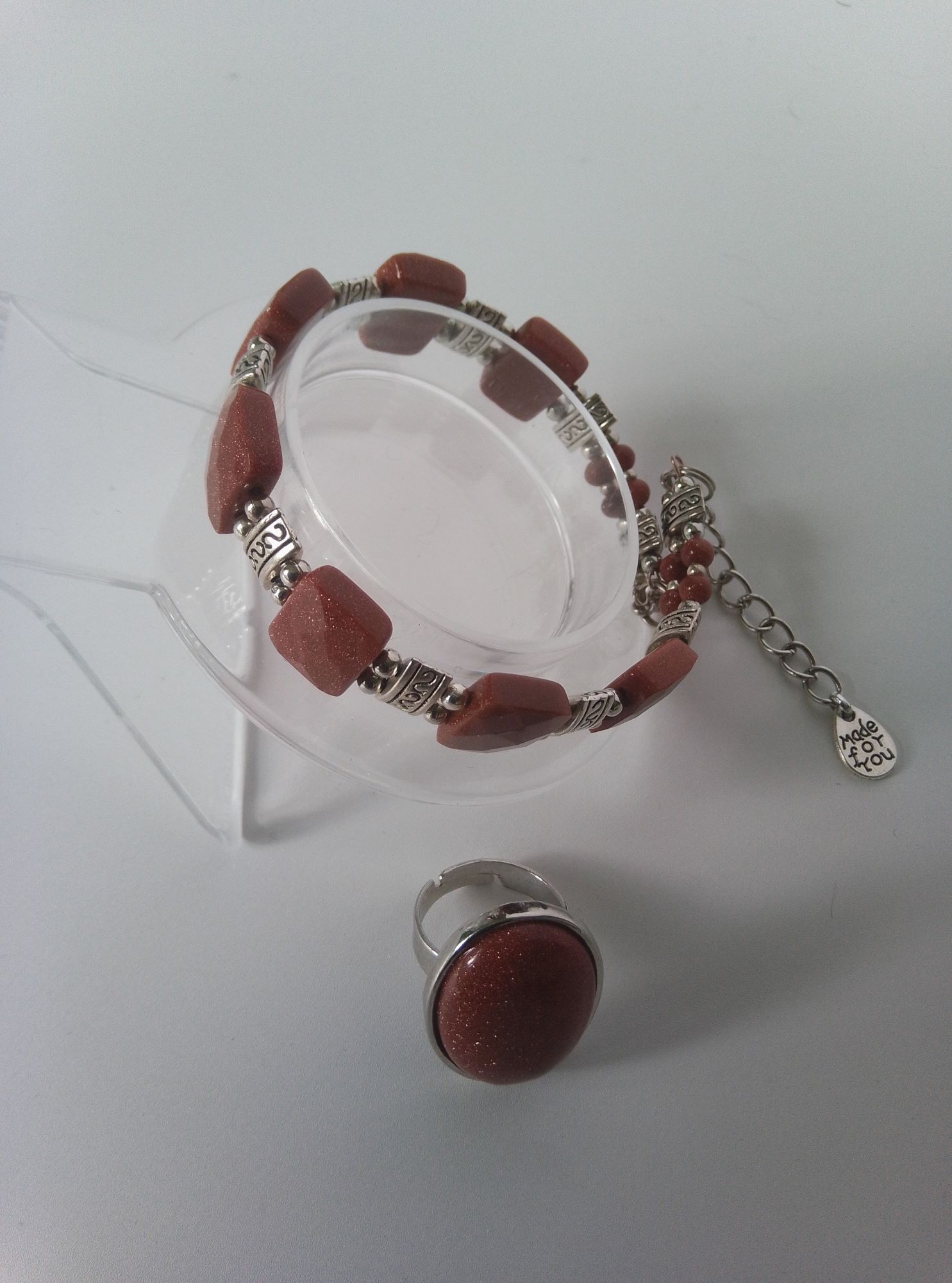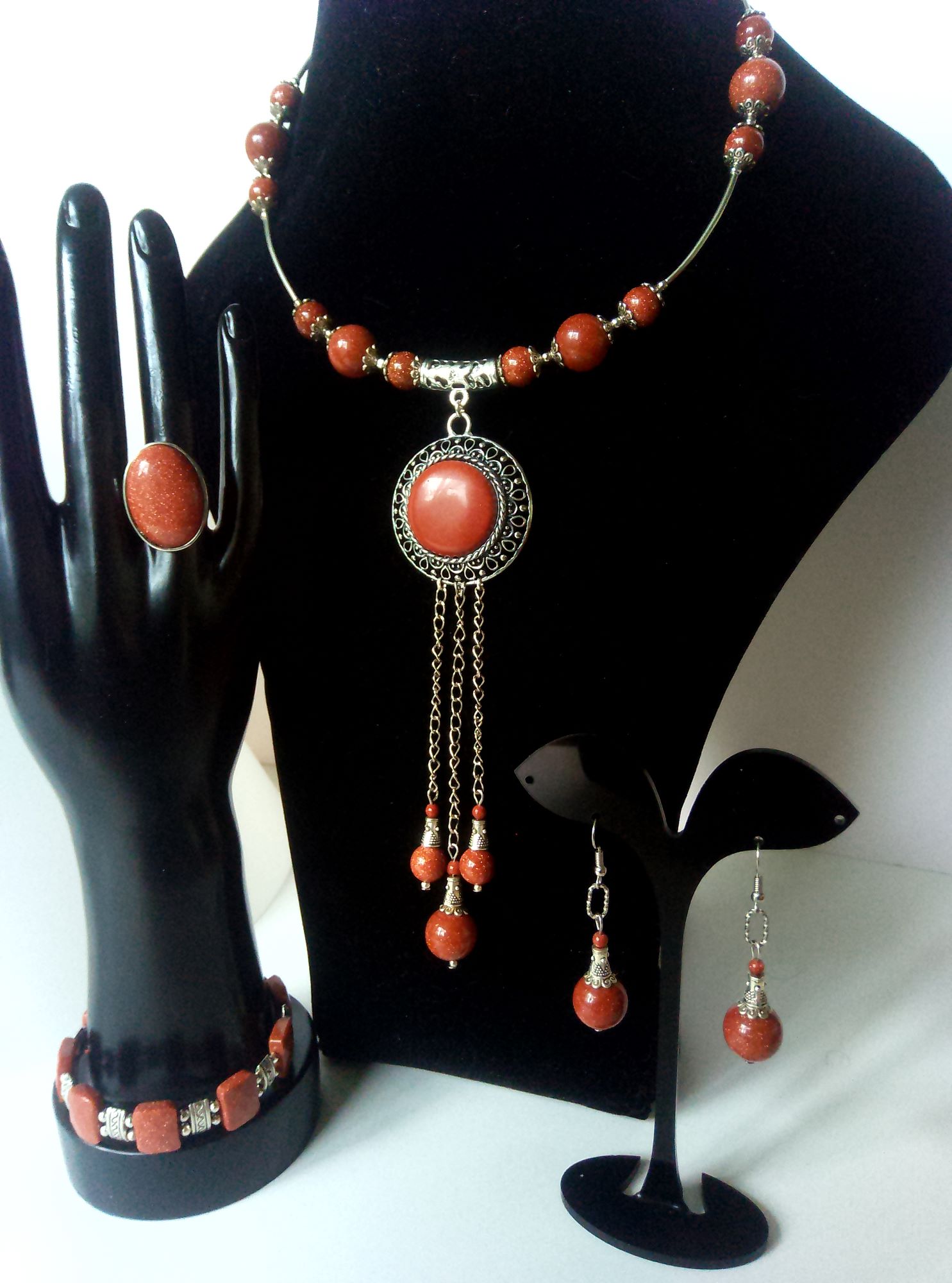 Комплект включает чокер на мемори-проволоке с подвеской 150х40 мм, двойной браслет на мемори-проволоке с удлинителем, серьги 60х14 мм с застежкой-петля, кольцо регулируемого размера с кабошоном в оправе 27х21 мм. Материалы — авантюрин «Золотой песок» бусины диаметром 14, 10, 6 и 4 мм, бусины прямоугольные граненые 15х10 мм, кабошон в подвеске 25 мм диаметром, кабошон в кольце 25х18 мм, сплав ювелирный, сталь нержавеющая. Фурнитура серебристого цвета.