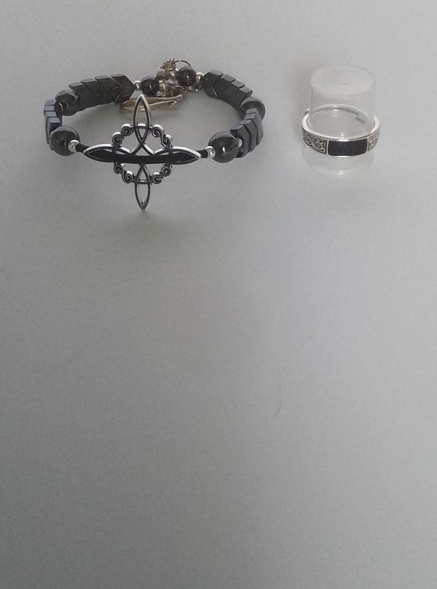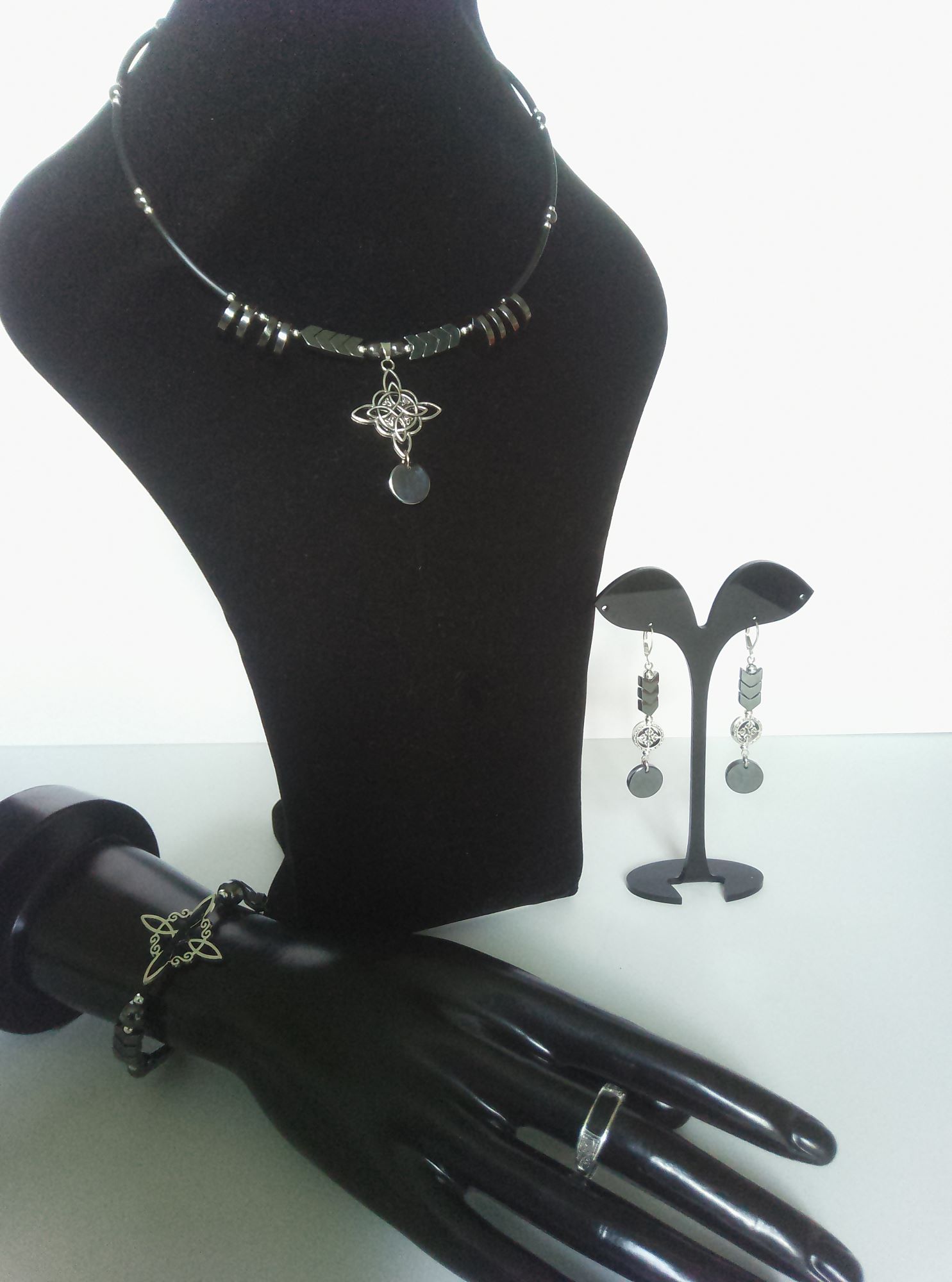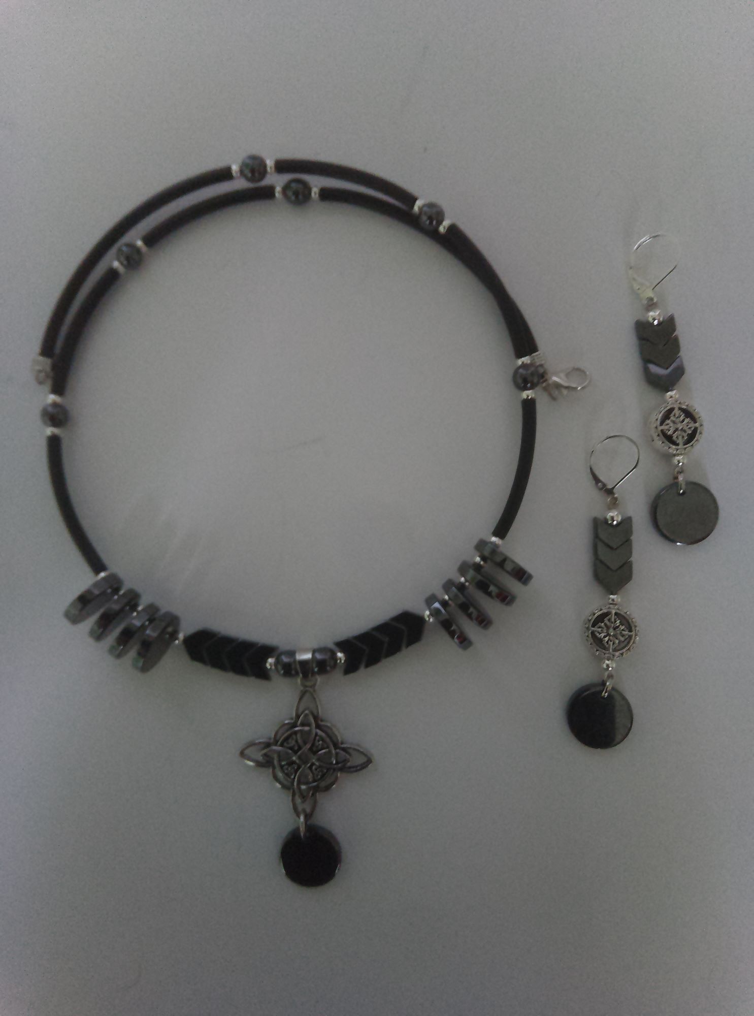 Комплект включает в себя чокер и браслет с удлинителем на мемори-проволоке, серьги 70х14 мм с застежкой левербек, кольцо регулируемого размера с черной эмалью. Материал — гематит бусины диски 14 мм диаметром, «змейка» 8х8 мм, бусины круглые диаметром 8 и 6 мм, шнур ПВХ полый. Фурнитура серебристого цвета.